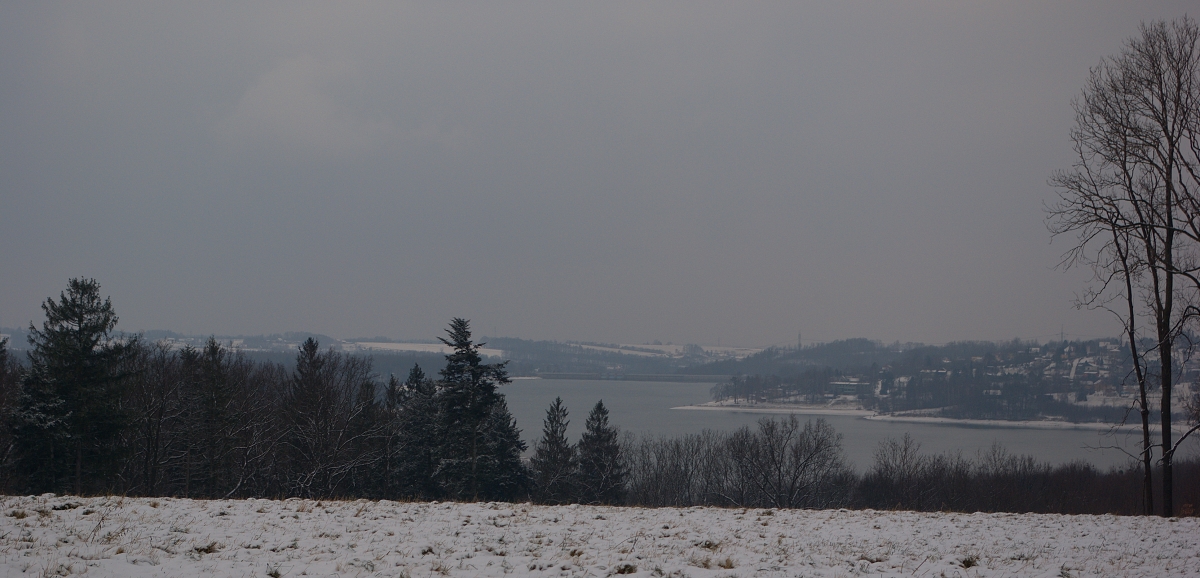 V dáli hráz Žermanické přehrady