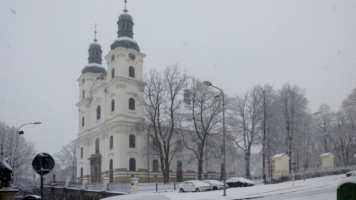 Došlo kafe, tož jsem se vypravil do Kauflandu, za těcj pět minut cesty jsem vypadal jako sněhulák. Po cestě zpátky mě napadlo vyzkoušet, jak se chová foťák v mobilu po opravě. Málem jsem s tím neuměl zacházet. Když jsem to koupil, tak to fungovalo hned. No nějak jsem ten kostel, při tom sněžení, vyfotil a doma půl hodiny nastavoval aby to bylo jak před tím než mi v opravně nahráli nové ovladání :?