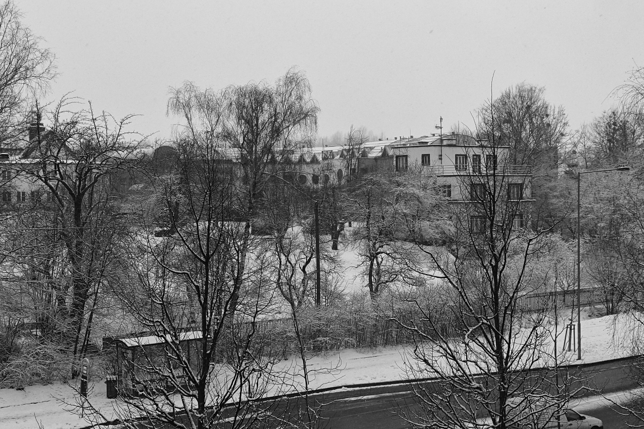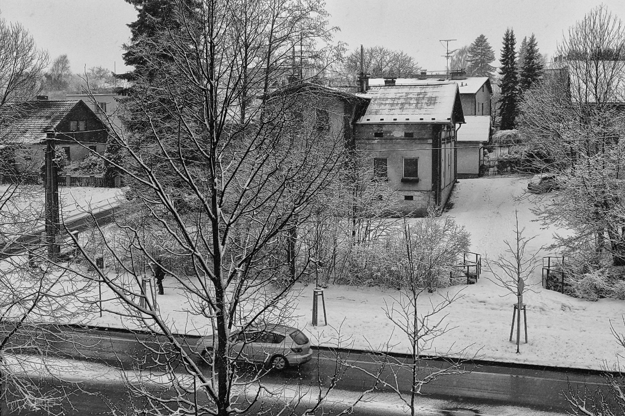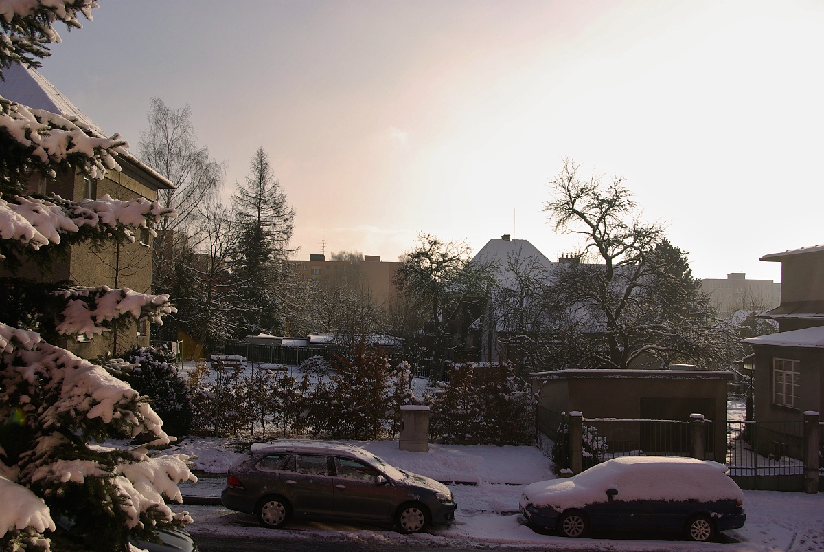 I když jsem tu psal, že už nebudu otravovat balkonovkami, přece jsem dvě cvakl, když přestalo sněžit. Alespoň stromy jsou trochu tím sněhem poprášené.