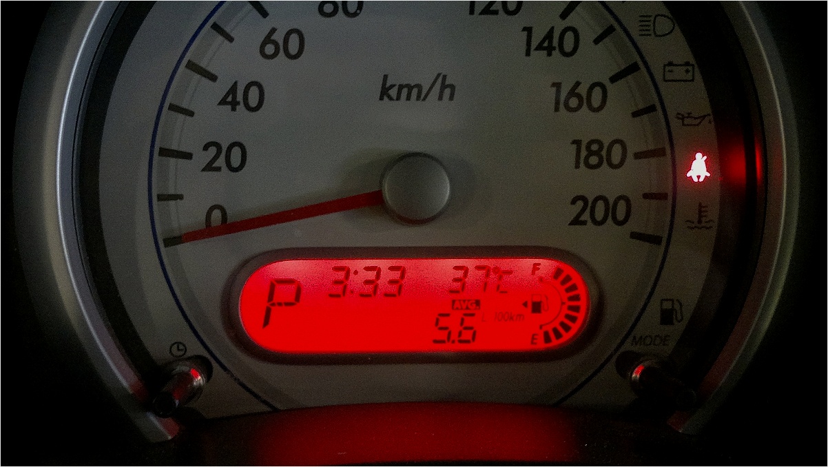 Legenda k tachometru...P režim parking, časový údaj, venkovní teplota a údaj 5,6 l/100 km ...průměrná spotřeba... :roll: