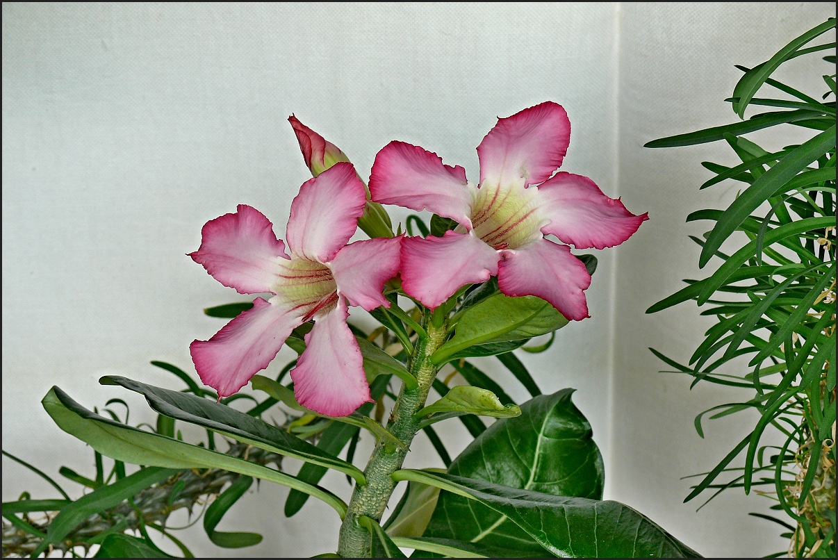 No rozkvetla nám pouštní růže, před pěti léty jsem koupil za 25 Kč pět semen, tři semena nevyklíčila, jedna rostlina tak tak žije a jedna nám dělá radost. Jen škoda, že je jedovatá, když shazuje listy, třeba dát pozor na psa
