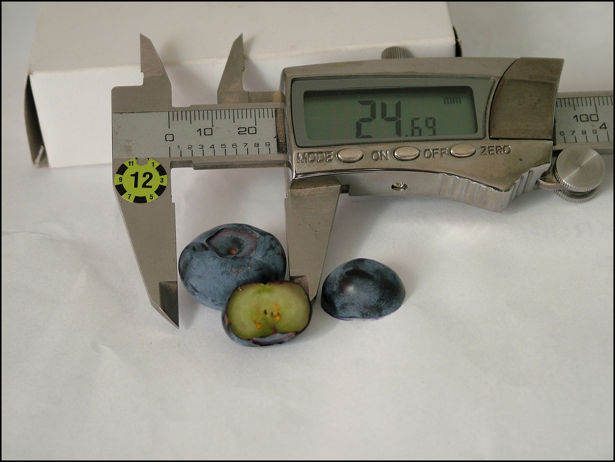 Dnes ráno jsem utrhl dvě borůvky. trochu se mi ta jedna pootočila, když jsem podkládal posuvku, aby na ní bylo pořádně vidět. Druhou borůvku jsem rozřízl, jsou takoví, kteří neměli možnost plod kanadské borůvky potkat. Nuže, borůvka nevoní (ale nevoní mi ani borůvky z lesa) a vevnitř je zelená, tedy při konzumaci ani nebarví zuby. Jinak je chuť dle mého názoru) shodná s chutí naších evropských lesních borůvek.