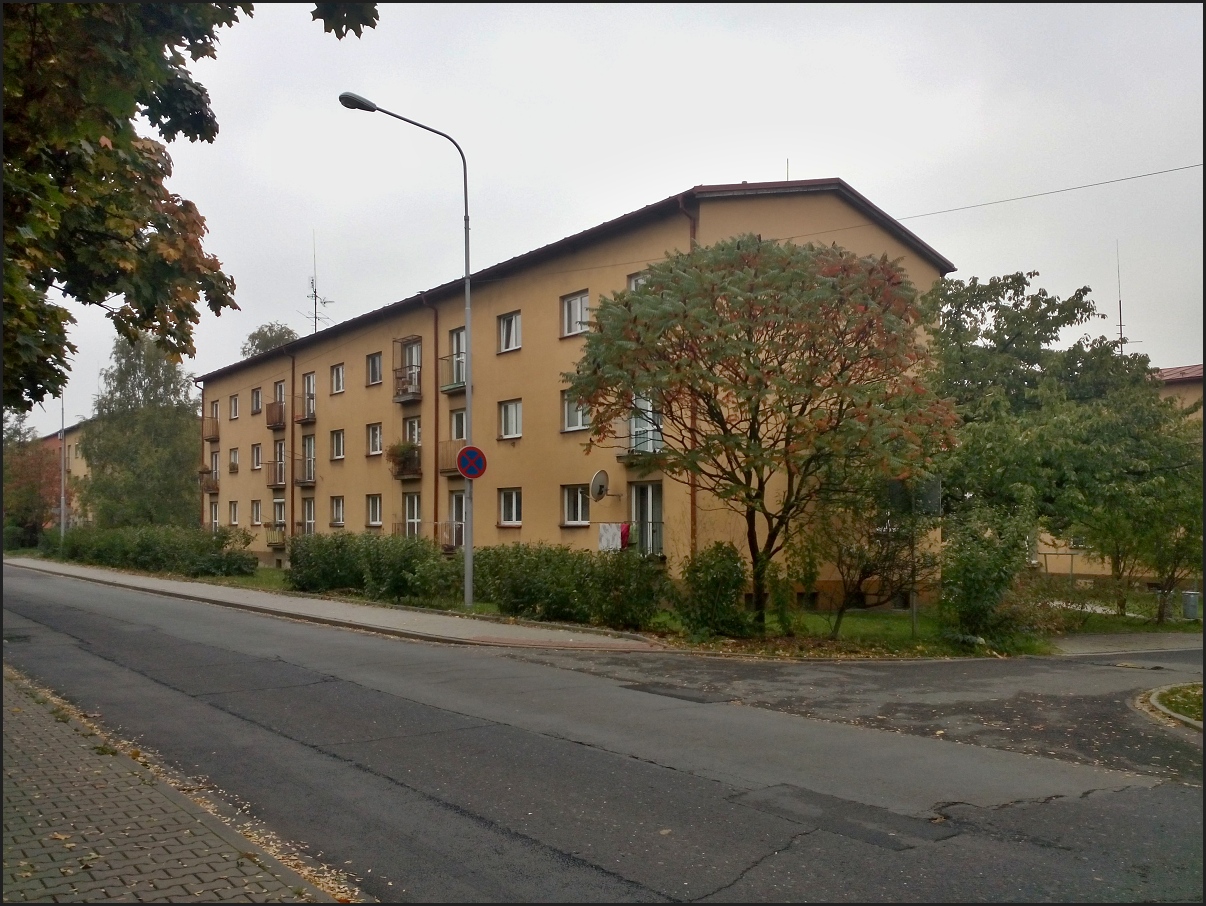 Pánové přeji příjemné skoro poledne. Pes se zlobil, že jen ležím v posteli, že v posteli lidi umírají, tak jsem s ním zašel na pravidelné kolečko. Cestou jsem cvaknul domy postavené po světové válce, v době dvouletého plánu, pro dělnictvo ve válcovnách a v mostárně. Připravuje se zateplování, tak ještě nějakou dobu sloužit svému účelu budou.