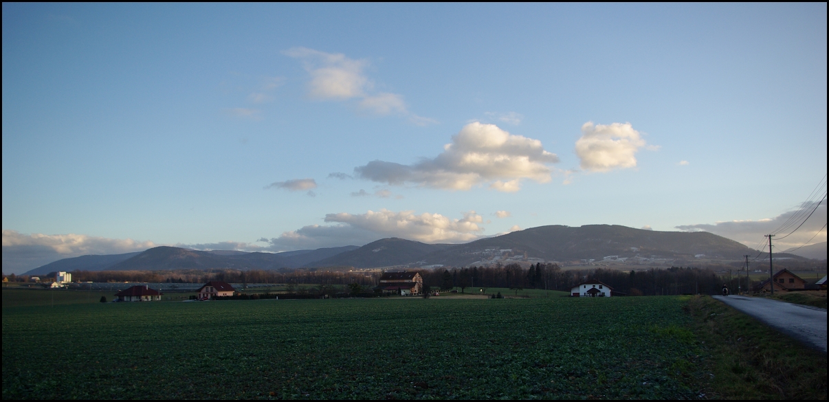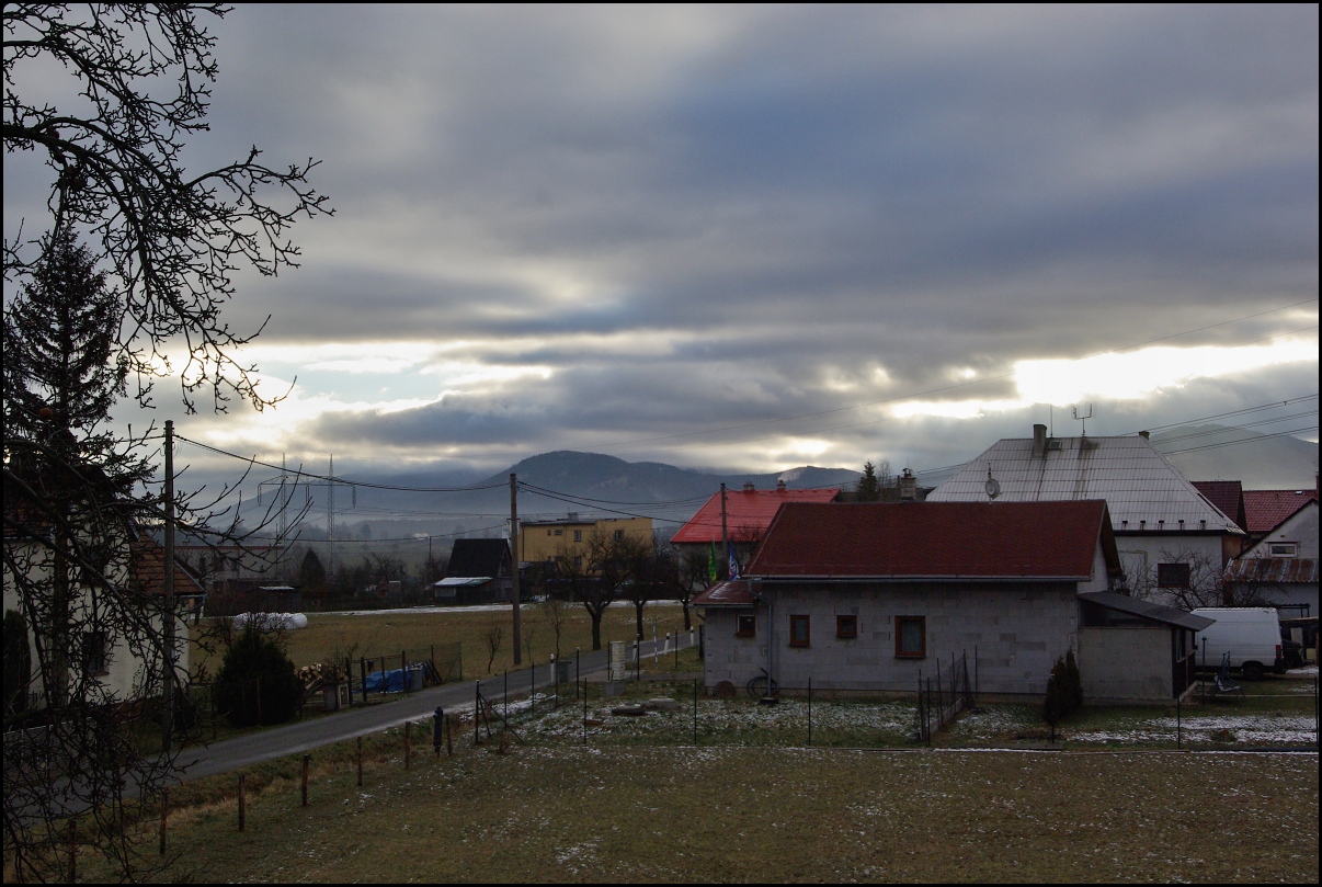 Když jsem na chvíli vystrčil z chalupy nos, tož jsem cvaknul hory před námi. Vidno zříti, že sněhu není. První kopec z pravé strany je Prašivá nějakých mizerných 843 metrů nadmořské výšky, sedlo před vrcholem 706 metrů. Když tam jdeme, tak obyčejně v sedle skončíme.