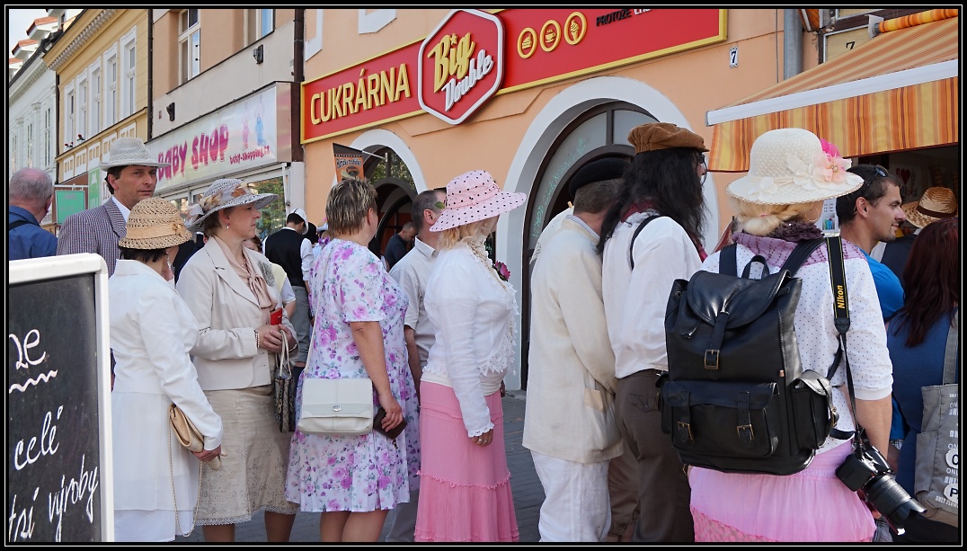 Přijeli k nám cykloturisté v krásných kostýmech a na nádherných starých kolech. Bylo jich asi 50, odhadem.