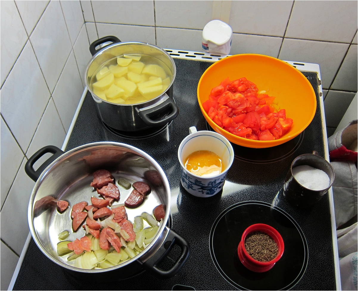 Gustave, cibule je v kastrolu, společně s pokrájenou uzeninou... (n)