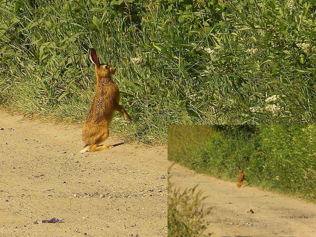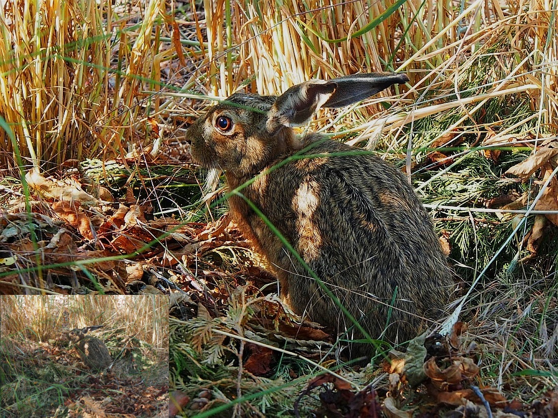 Přidám ještě jednoho zaječího mladíka, který mě nechal příjít asi na 2,5 m. Zřejmě pochopil, že na dálku bych ho "s padesátkou objektivem" moc nevzal :( - je to také ve výřezu, (celek v levém dolním koutu) :o