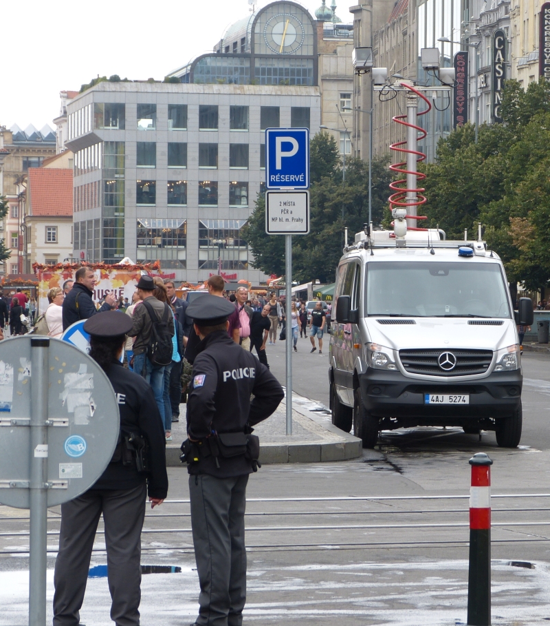 Před odjezdem zbyl nějaký čas, takže odskok na Václavák. Netušil jsem, proč ta teleskopická tyčka se dvěma otočnými kamerami. Prý zase nějaká demonstrace. Opletalovou na nádraží. Tam na mě juknul policejní anton.