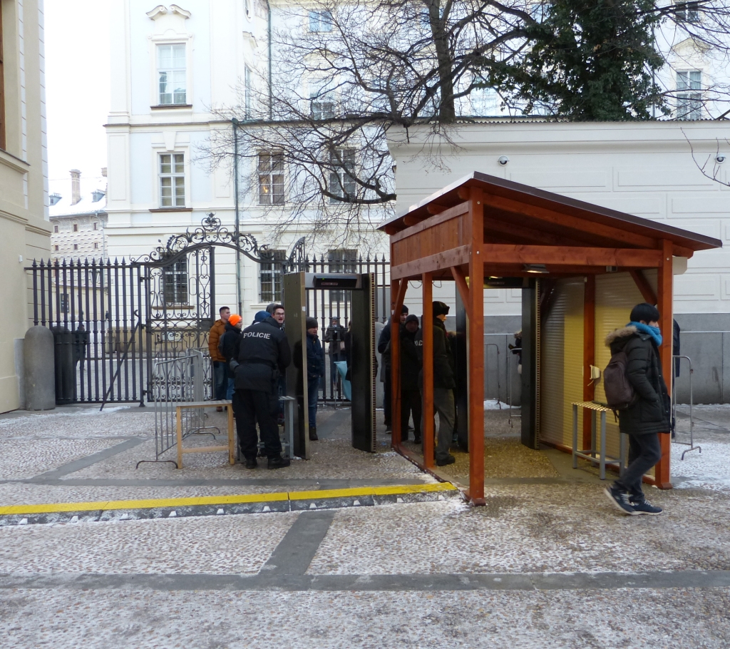 Nebo tam s Moraváky vůbec nepočítají? Česky mi pak vysvětlil, že je tam pouze východ. Řekl jsem mu, že v tom případě jdu správně, protože jsem šel na východ. Naštěstí to pojal jako můj humor, takže mě nakonec nasměroval vlevo k boční bráně, kde čekalo několik lidí. Netušil jsem, že opravdu je Hrad tak hlídán. Musel jsem projít bezpečnostním rámem. Napřed ale položit foťák na stoleček, vyndat všechny klíče a drobné z kapes. Na stoleček jsem položil i svůj klasický mobil. Zřejmě na takové mobily nejsou zvyklí, takže po mně chtěl, abych dal na stoleček mobil. Musel jsem vysvětlit, že