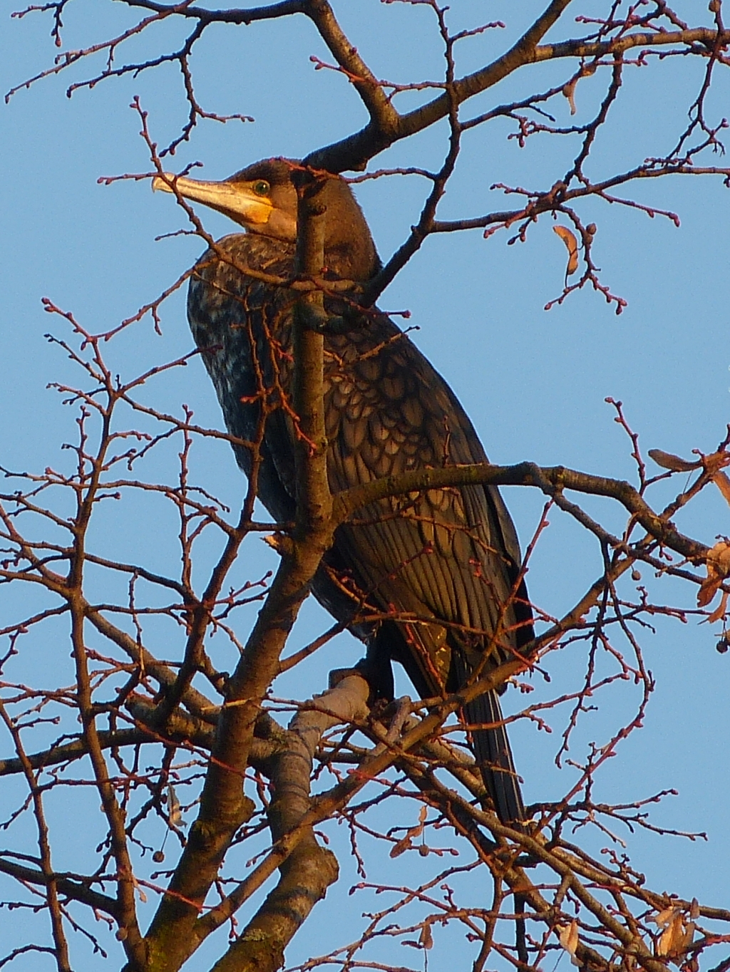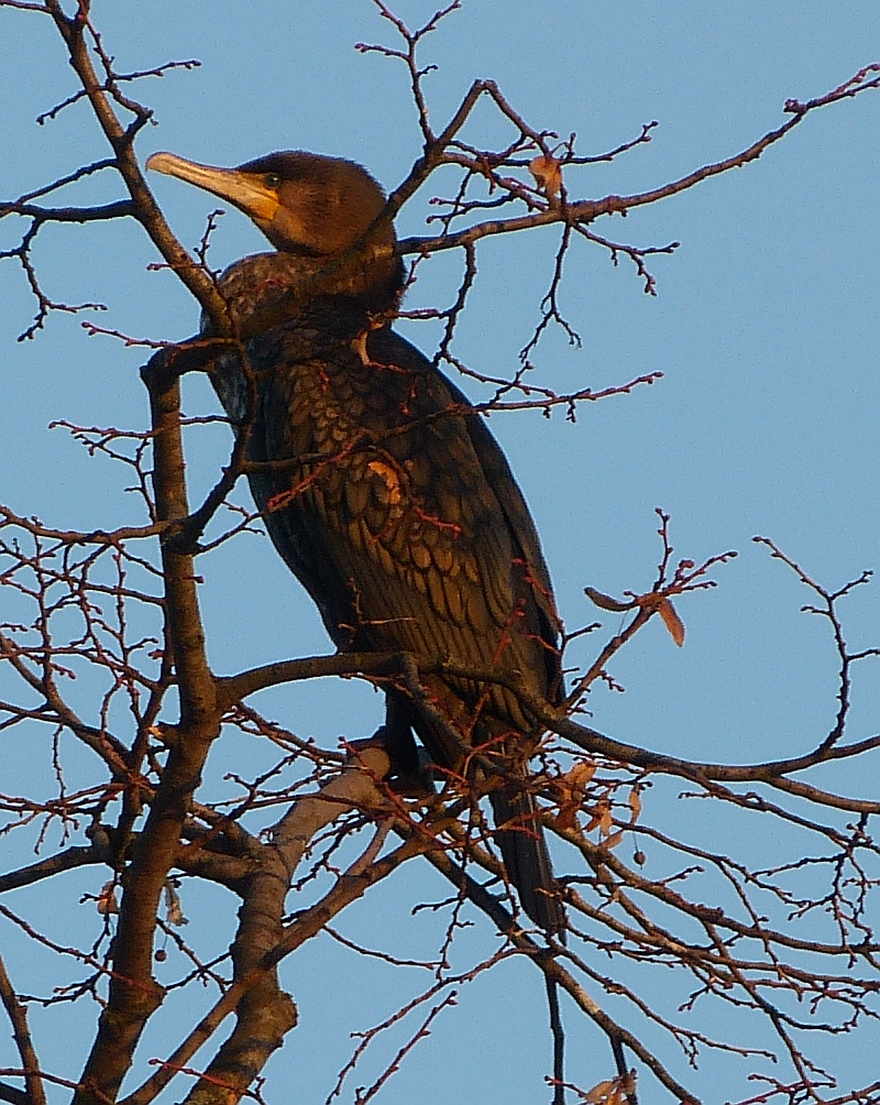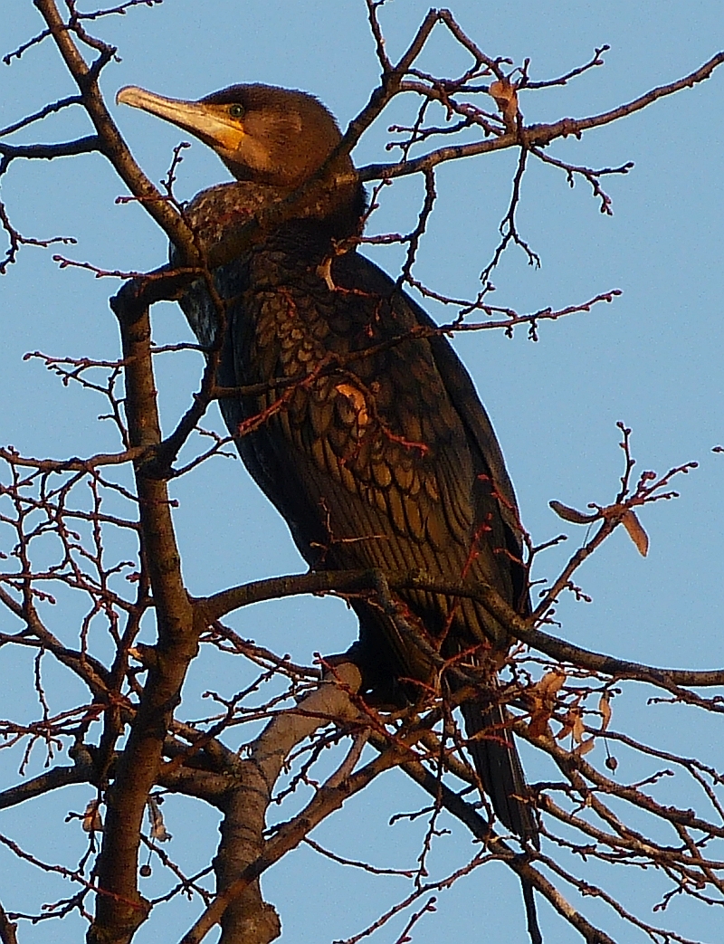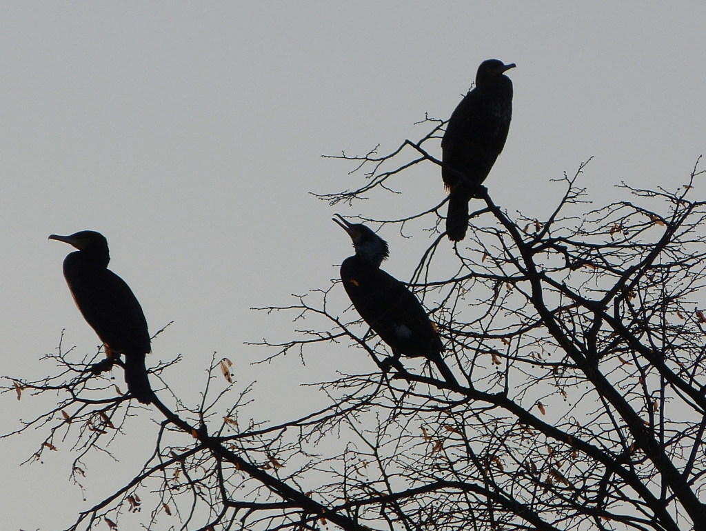 Dnes jsem šel pěšky a vzal jsem to cestou, kde jsem kormorány viděl z auta. V tom místě sice přímo nebyli, ale mnoho jich létalo na řekou. Až jsem jich pár zastihl odpočívat na stromě. Vídám je až poslední roky, dříve jsem si nevšiml. Vyfotit tu potvoru nebylo snadné. Z jedné strany protisvětlo zapadajícího sluníčka, jinak zoom na plné kule a s přispěním ještě digitálního. A bez stativu, ten by mi nejspíš srazilo první auto