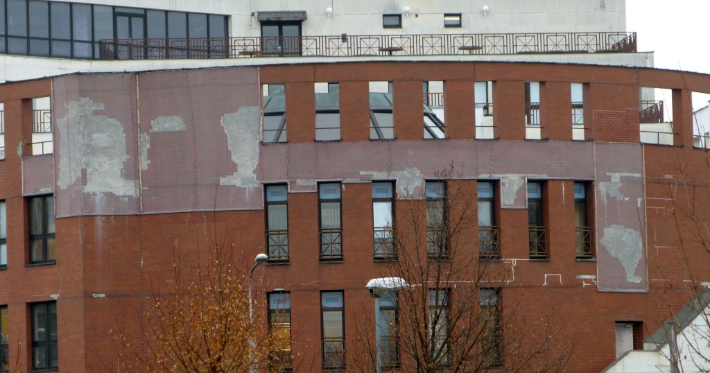 A kousek Zlína. Myslel jsem, že jde o nějaké umělecké dílo na fasádě domu. Dnes je možné všechno. Ale při přiblížení jsem zjistil, že tam padá obložení a je to zakryto plachtou.