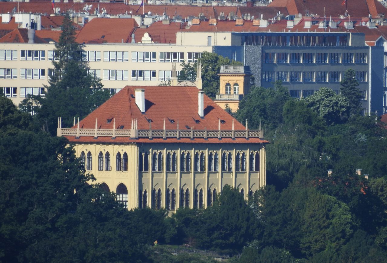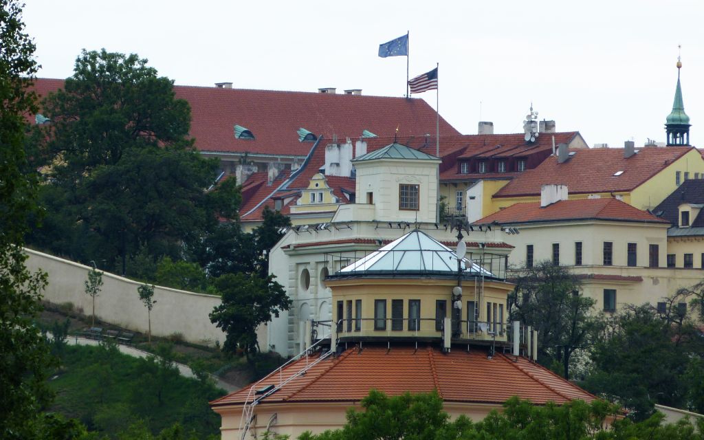 Takže se lze podívat i na střechu ruského velvyslanectví (vlevo od Místodržitelského letohrádku). Náměstíčko už se však nejmenuje Pod Kaštany, ale Borise Němcova
