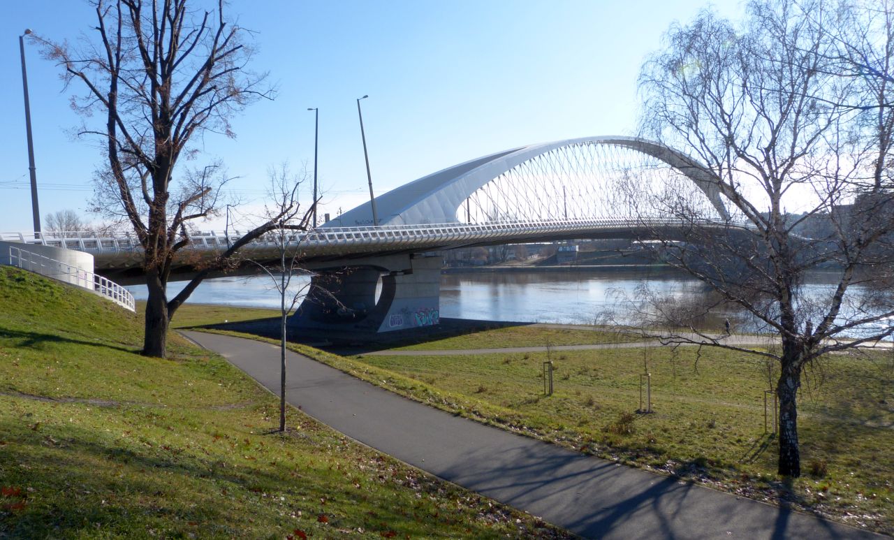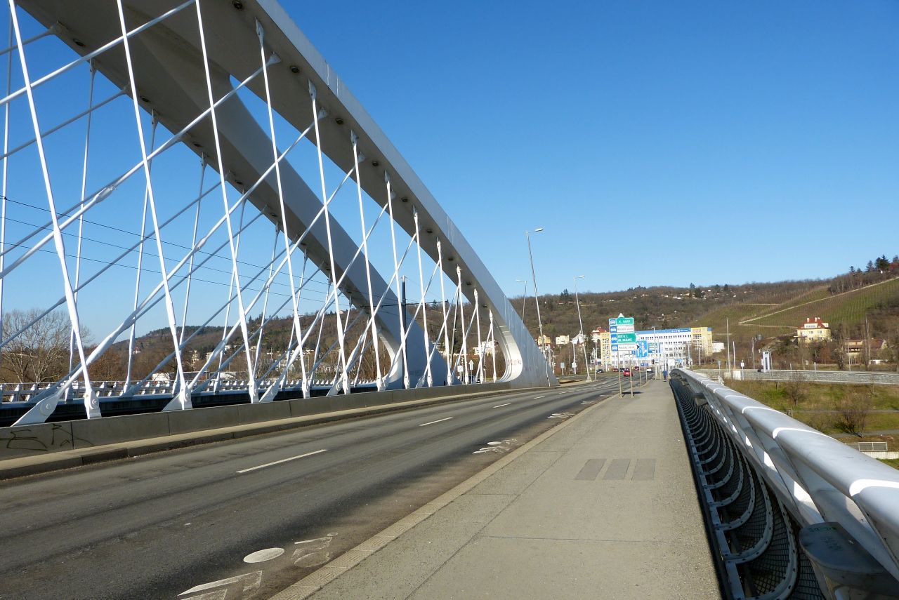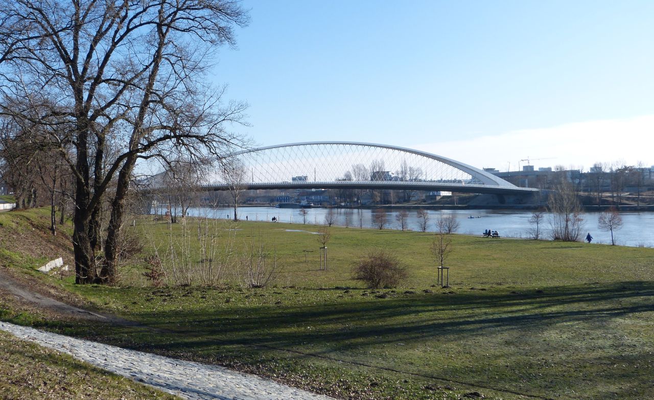 Trójský most, pěkné výhledy z mostu, směr trojská lávka, Stromovka a bývalá Julda Fulda, dnes jen Výstaviště Holešovice.