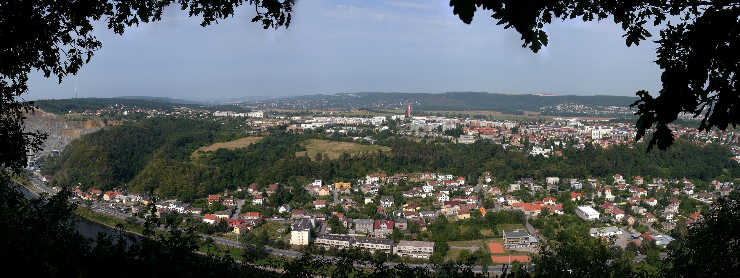 Je to pohled na Zbraslav od keltského oppida Závist. Snímek je hodně starý, to jsem začínal s digitálem, je složen z několika snímku do panoramatu. Vzpomínám si, že zde byl velký problém najít místo, odkud by byla vidět největší část Zbraslavi. Vlevo je stále funkční lom "Kámen Zbraslav" a nad ním vysílač "Cukrák". ( Olympus C 5050 )