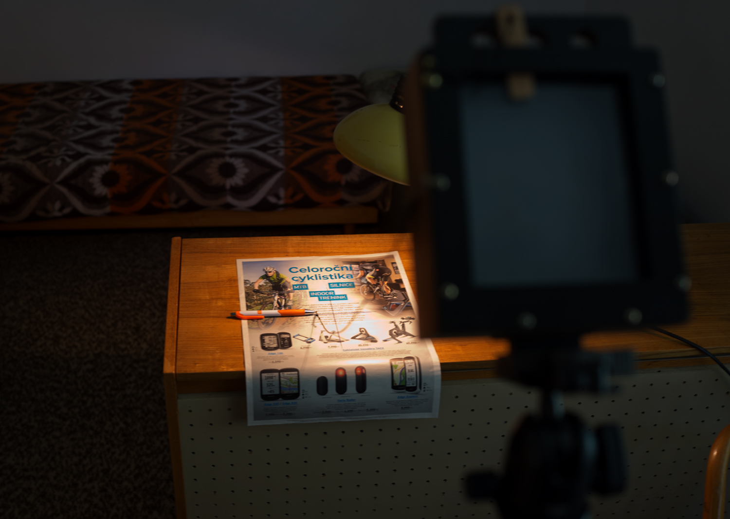 Potom se přímo nabízí při tomto nastavení zjistit si přesně zaostřenou rovinu na šikmo položených novinách podle zaostřených řádků na matnici. Navíc v tomto případě může být tato předloha řádně nasvícená. No a zbývá jediné, na provázku přichyceném k fotoaparátu si v tomto místě udělat uzlík.