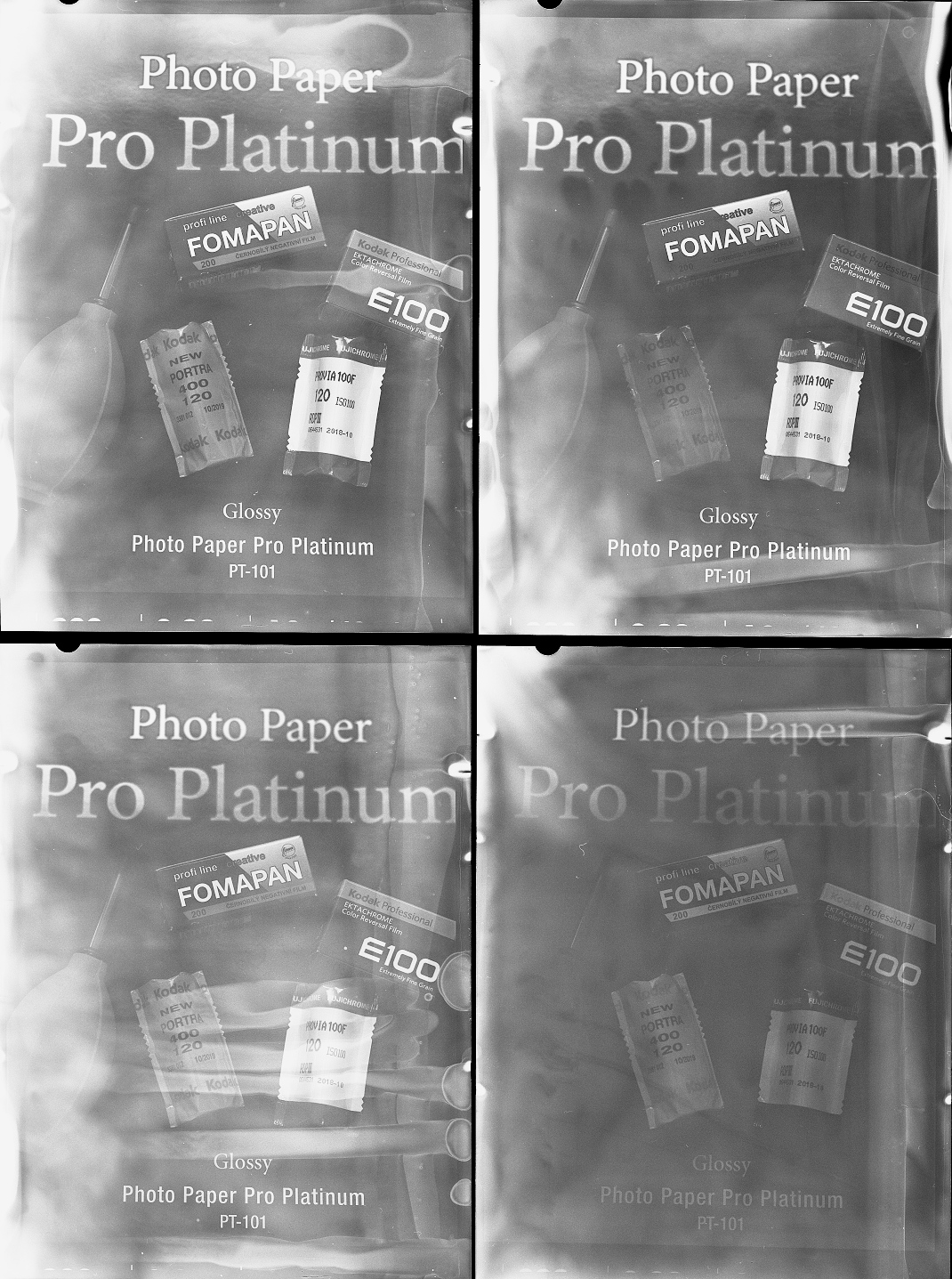 Planfilmy společně vyvolané, každý jinou vadu, tak ani neodpovídá hladina nalití vývojky před přelkopením a navíc to bylo skoro plné.