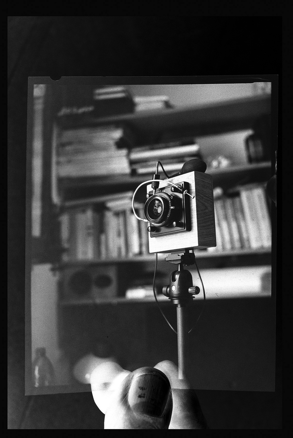 Výřez z celého snímku jen fotoaparát. Bohužel jsem nedokázal mým způsobem celý snímek naskenovat. Dílčí snímky, které byly celé máznuté nedokážu potom spojit do jednoho snímku. V tomto případě můj "skener" totálně selhává.