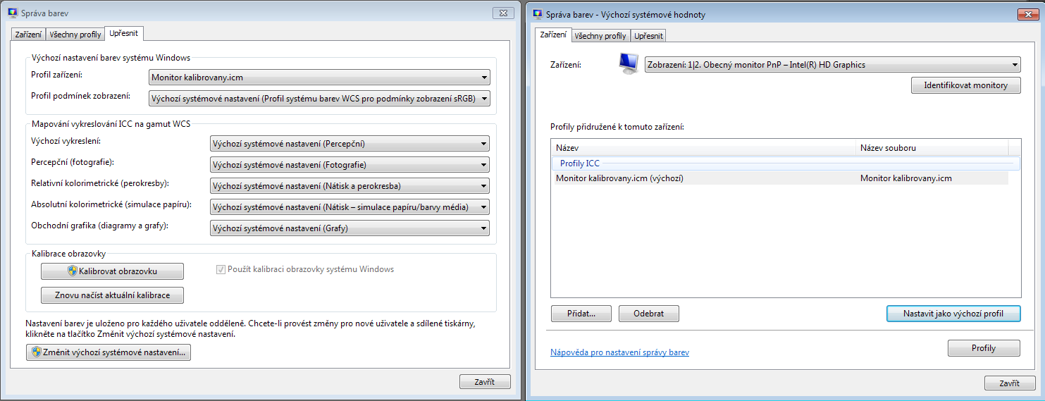 1) Deaktivovat nevhodný profil monitoru = NEZATRHNOUT možnost "Použít kalibraci obrazovky systému Windows" ve správě barev o.s.
