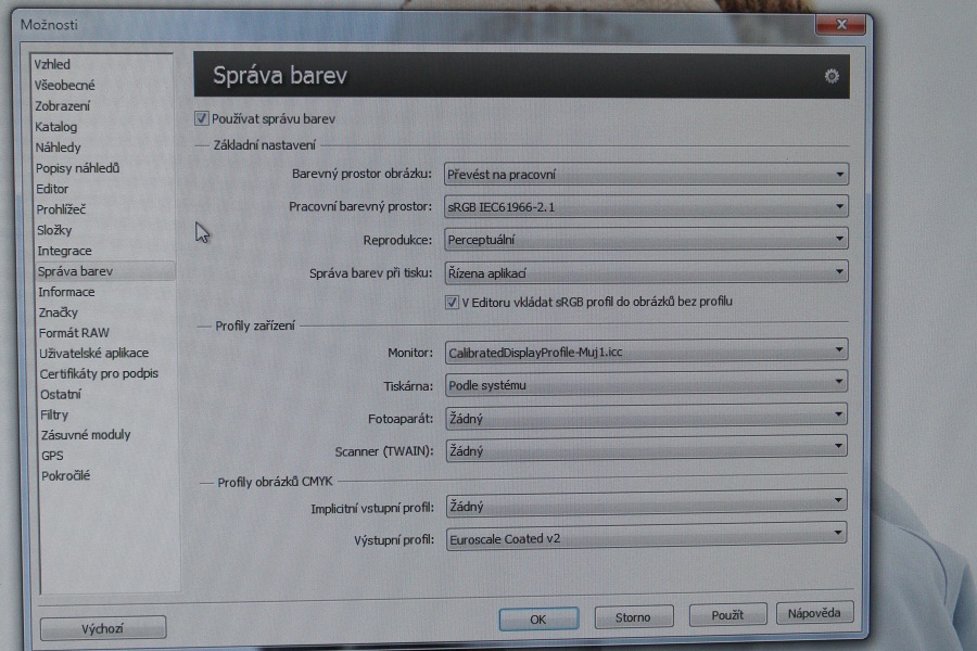 Použití vytvořeného icc profilu monitoru