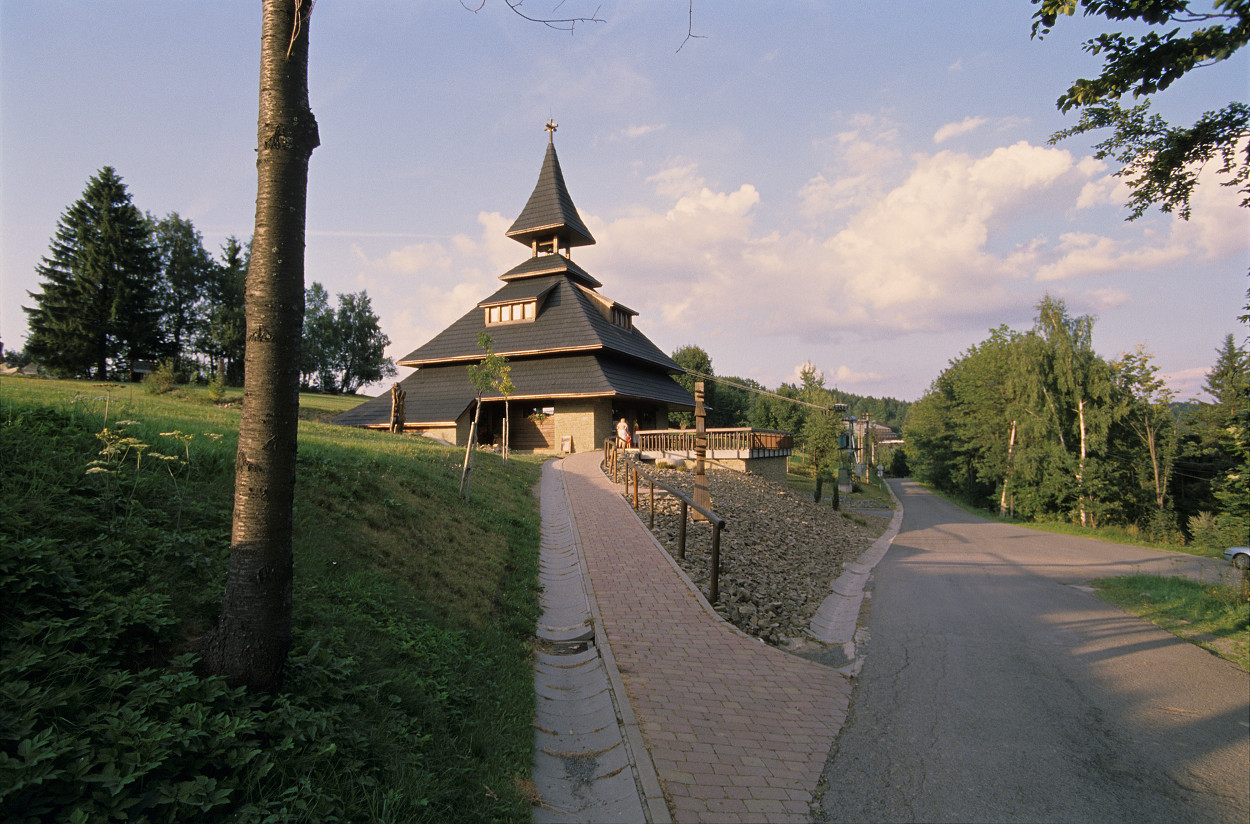 Tak tedy Kodak. Přesně po roce jsem se vrátil do Velkých Karlovic a zase pofotil kolem hotelu Horal. Tenkrát to byla Provia 100 a pevná 55/2,8 Micro, teď jsem tam měl ten Kodak ze Soláně a lehký manuální zoom 75-150/3,5E. Fotil jsem cca o 3 hodiny později a udržet to trochu solidně z ruky už nebyla žádná sranda. Takže clona nejčastěji 5,6, což je i na 75 mm dost málo. Navíc mraky měly zpočátku dost málo pochopení a dlouho skoro stály na místě :? .
