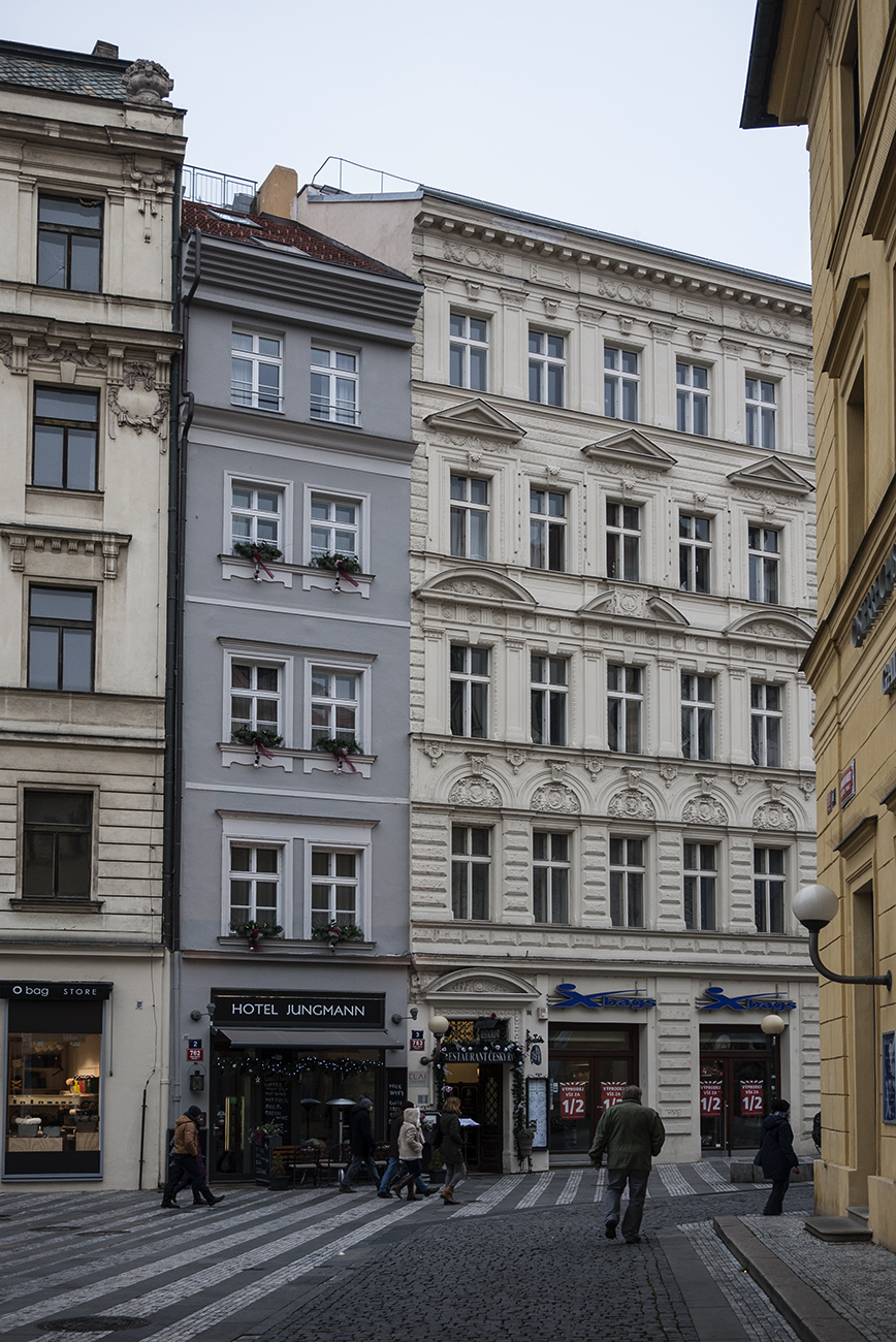 Podivné průčelí hotelu "Jungmann" v Praze na Jungmannově náměstí.