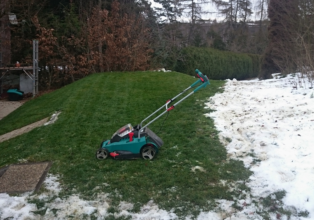 Dnes mě došla trpělivost s přerostlou trávou, která ve slunném závětří narostla během listopadu a prosince. Pokud bych jí neposekal, do jara by chytla sněžnou plíseň. Tak jsem se naštval a 9. ledna jsem uskutečnil první letošní seč!