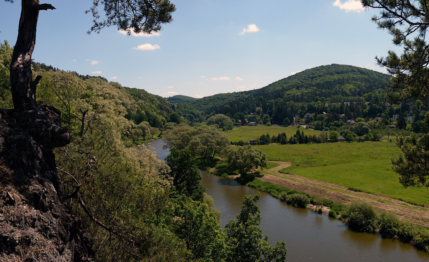 Pohled na Sázavu z Petrova. V pozadí ten kopec vpravo je pověstný trempský výletní cíl, Medník.