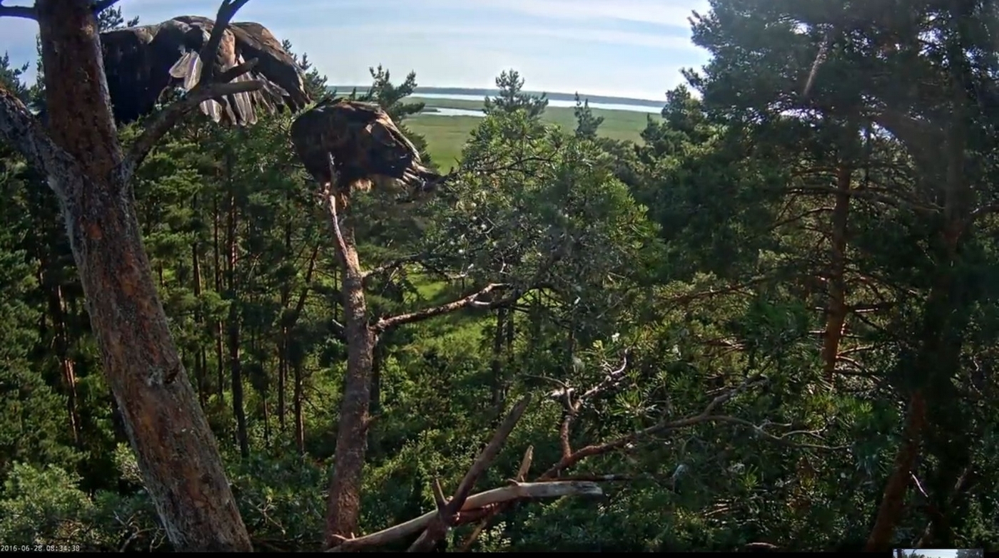 V úterý 28. června usku­teč­nil svůj první let nej­starší z tro­jice orlů – Nord. Rahuův vče­rejší výkon mu zřejmě nedal spát, a tak se na orlí zkoušku odvahy vydal již za sví­tání. Přesný čas bohu­žel nelze s jis­to­tou určit, víme ale, že odle­těl před čtvr­tou hodi­nou ranní. Přes den jsme Norda mohli spat­řit jenom při jeho krát­kých prů­le­tech kolem hnízd­ního stromu. Na násle­du­jí­cím videu je na krátký oka­mžik jeho let zachy­cen (cca v 0:23).