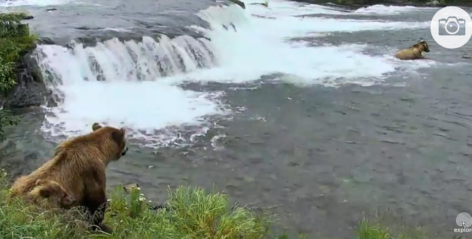 Dole na toku mezi medvědy chytají lidé ryby...