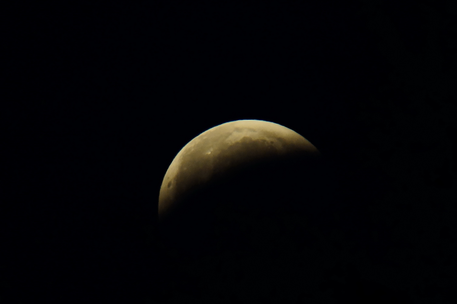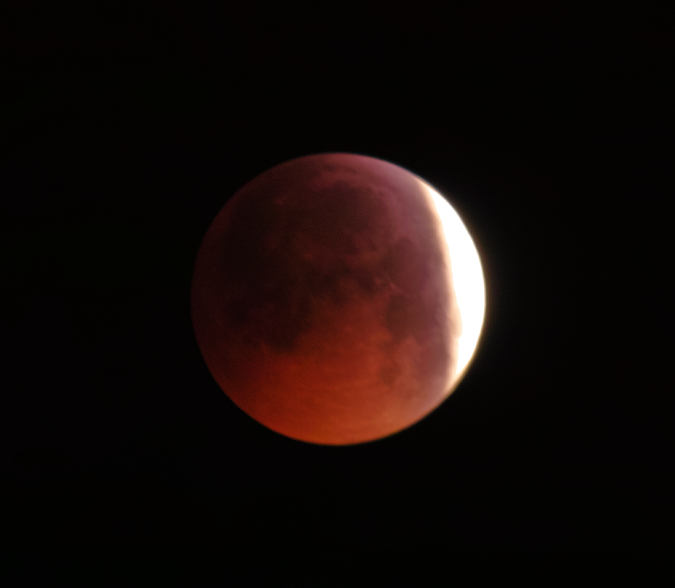 A jinak, kdybych v tu sobotu věděl, že bude zatmění, ani bych ten objektiv nesundával a dával bacha, abych nepohl zaostřovacím kroužkem. Jenomže jsem ho sundal a kroužkem patrně nechtěně trochu pohnul. O zatmění jsem se dozvěděl až včera večer ze zpráv. Tak jsem to dal znovu dohromady i s telekonvertorem a doufal, že zaostření se od soboty nezměnilo. Bohužel tolik štěstí jsem neměl. V hledáčku jsem to nepoznal a na tmavý měsíc bych nezaostřil vůbec. Ani na světlý měsíc s jistotou v noci nezaostřím. Takže je to mizérie, navíc se za ty čtyři až pět vteřin viditelně posune. Čím byl níž, tím víc se rozmazával ve světelném a kouřovém smogu. A taky začínalo svítat. Ještě že jsem mohl fotit z balkónu... Výřezy radši dávat ani nebudu... (y)