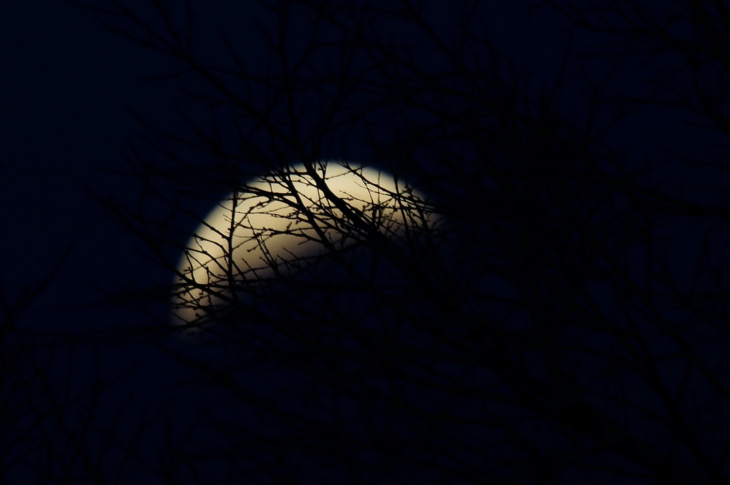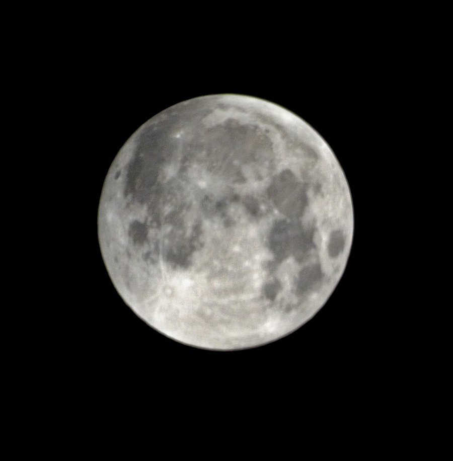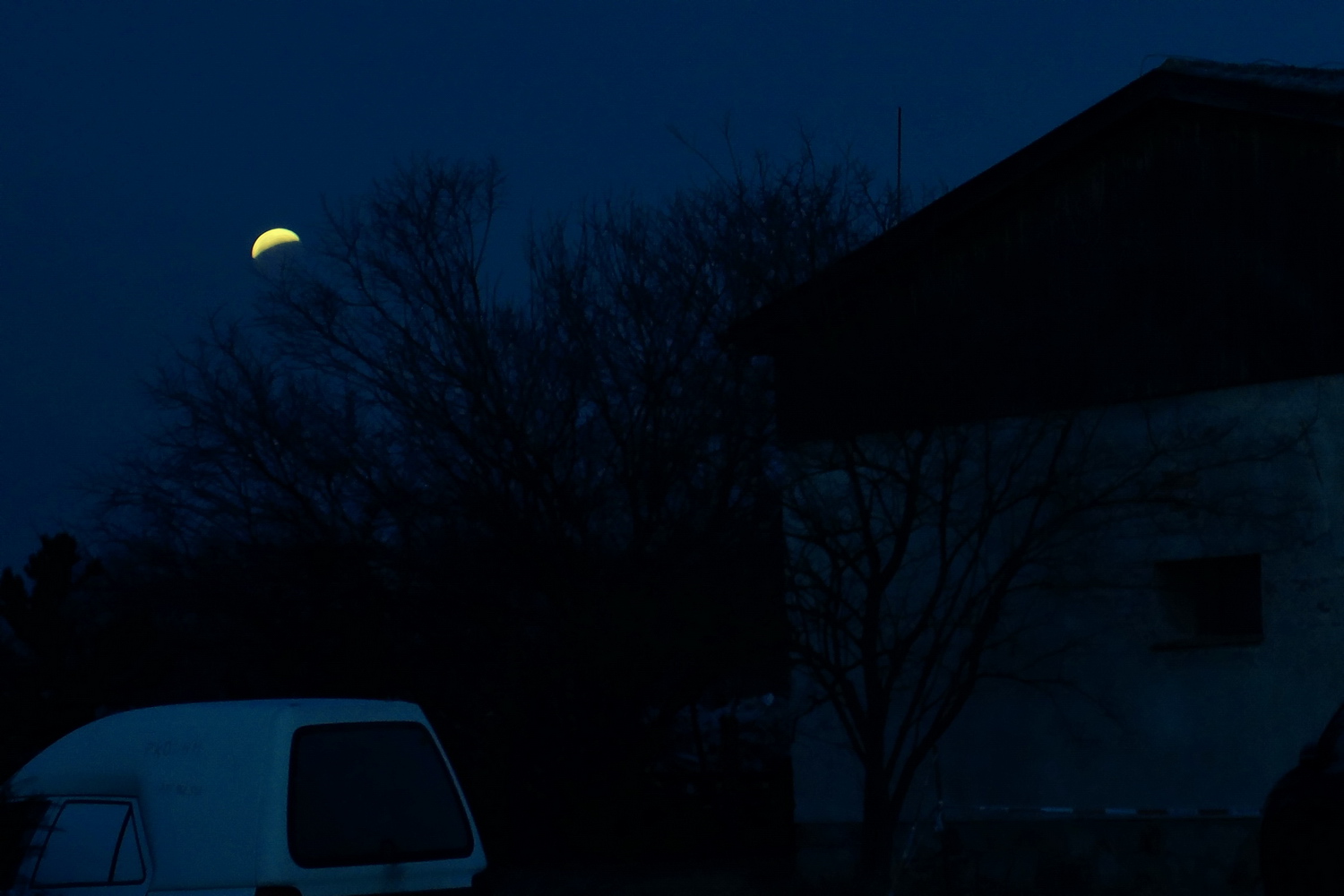 Tak možná jsem si to ani moc nerozostřil. Ukazuje se, že největším nepřítelem ostrosti je skutečně ten dlouhý čas a klesající výška Měsíce. Toto je první fotka na 2 vteřiny a je viditelně ostřejší. Pak je ještě otázka, jak se projevuje tepelná roztažnost materiálu objektivu. Tady byl venku jenom pár minut, u posledních fotek skoro hodinu a půl. Možná jsem měl vyzkoušet 800 ISO na půl vteřiny... ;) :D