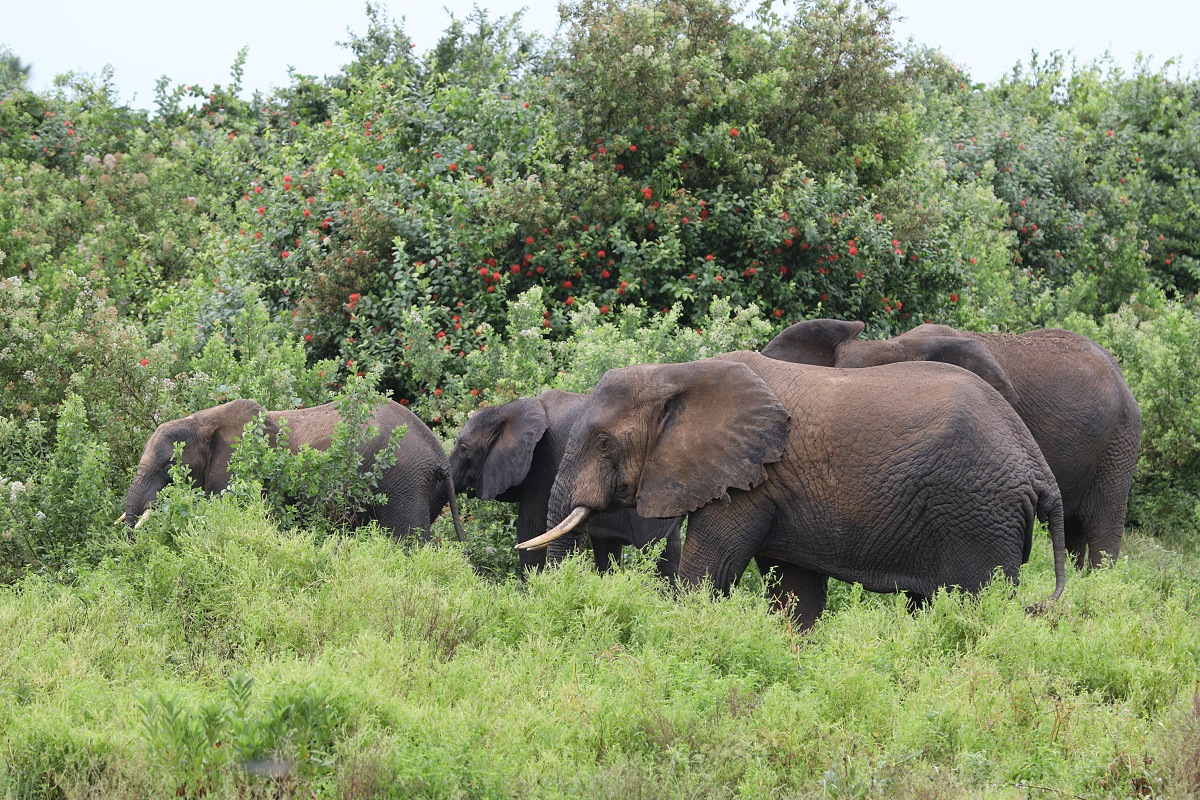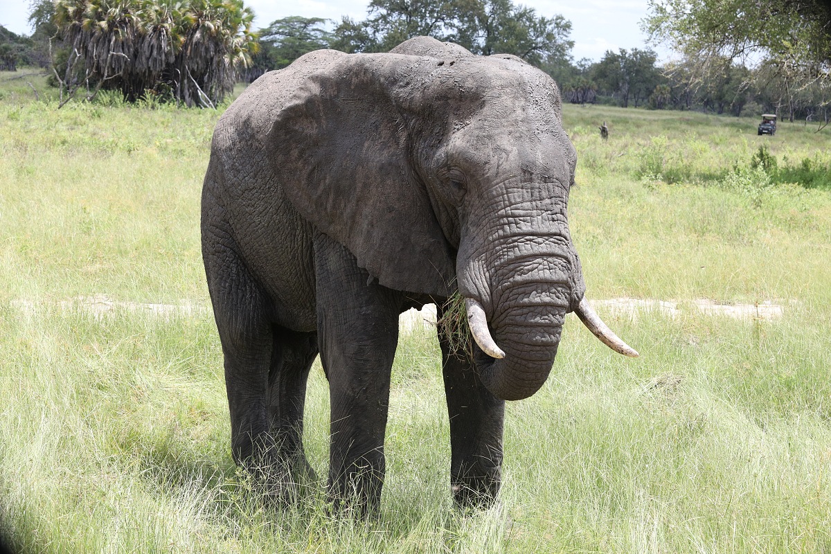 Je docela silný zážitek, když téměř na dosah ruky od vás slon žere trávu. Taková hora masa a pokud vy mu nijak neublížíte, je velmi vysoká pravděpodobnost, že i on vás nechá na pokoji. A ukázalo se, že je to potvora chytrá :-)! Chobotem utrhne chomáč trávy, vloží si ho do tlamy a ukousne jen tu vrchní část, spodek trávy s kořínky a zbytky hlíny nechá spadnout na zem. Proč by žral hlínu, že? Za jeden den dospělý slon sežere až 300kg trávy a vypije zhruba 200l vody. To už je slušná porce!