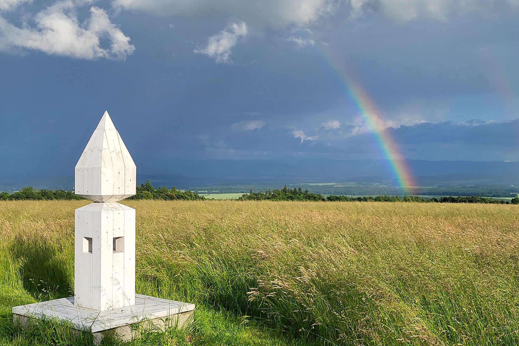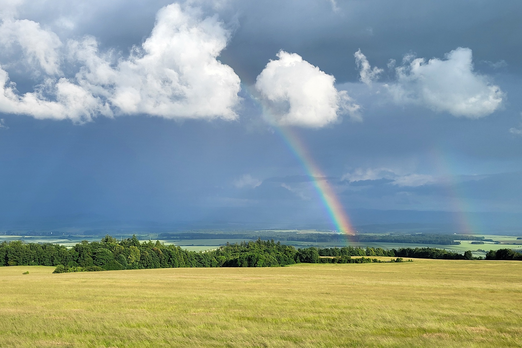 Krásný kontrast mezi tmavou oblohou v pozadí (Beskydy, Vsetínské vrchy, Hostýnské vrchy) a duhou vůči světlému popředí.