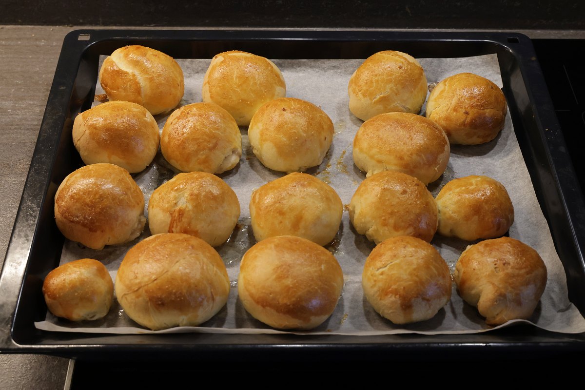 Druhý den se zadělá na kynuté těsto a pak se to postupně plní tím masem. Buď ve formě štrůdlu nebo malých bochánků. My děláme obojí...