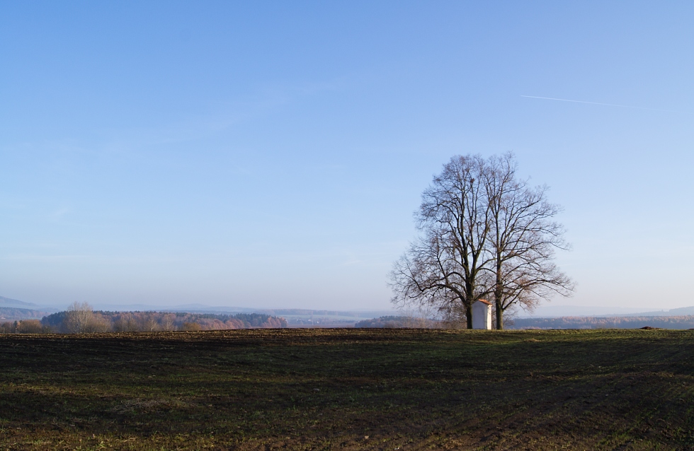 Ještě jedna v polích. Kolem Mýta buď byli lidi dřív hodně pobožní a nebo velcí hříšníci. Je tam vystavěný kostel, kousek pod ním kaplička u cesty mezi stromy a z druhé strany nad kostelem ta v polích.