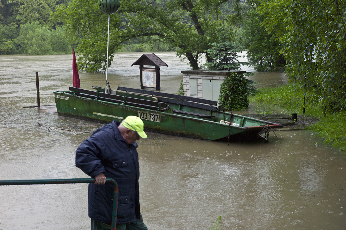 Ráno jsem zjistil, že průtok se zvýšil podstatně víc, zatlučený kolík na úvazek lodi pod vodou, loď vzdálená z obou stran asi 4 metry od břehu. Co mě zbývalo, zanořit se do vody a hledat lano se zatlučeným kolíkem pod vodou. Pochopitelně jen hmatem, voda na koukání pod vodou nebyla. Naštěstí kolík byl pod vodou asi jen 2 m a v tuto ranní dobu ( asi 06:00 ) lidi ještě spali, takže neviděli přívozníka v rouše Adamově! :-)