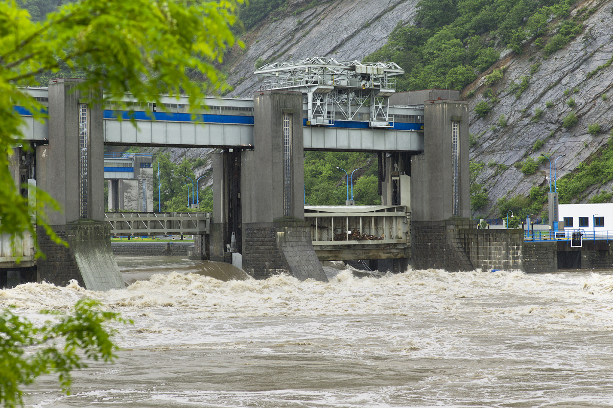 U snímku přehrady si povšimněte posledního přepadu. Voda už nejde přes něj, ale je tak zvednutý, aby voda tekla pod ním. Nastavuje se tak v případě extremních průtoků, aby přepad kladl vodě menší odpor. V roce 2002 tak byly nastaveny všechny čtyři přepady a rozdíl mezi hladinama byl asi jen půl metru. V této době byly otevřeny ještě i vrata zdymadla. Normálně je rozdíl obou hladin asi 8 až 10 metrů. Je to potřebný spád turbin. Při spádech menších elektrárna nejede. V současnosti je voda přehrady neyužita ( kaplanky )