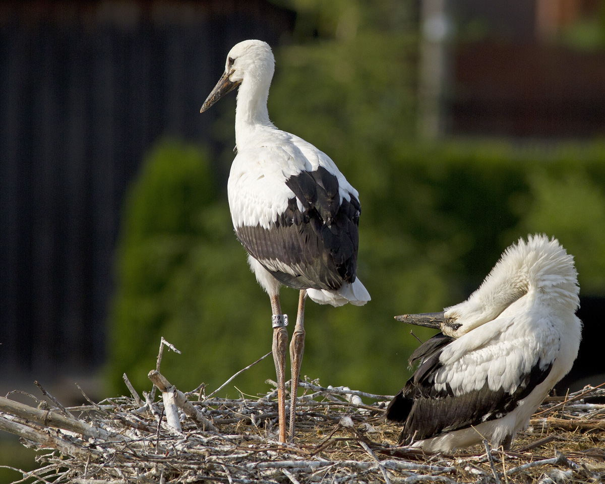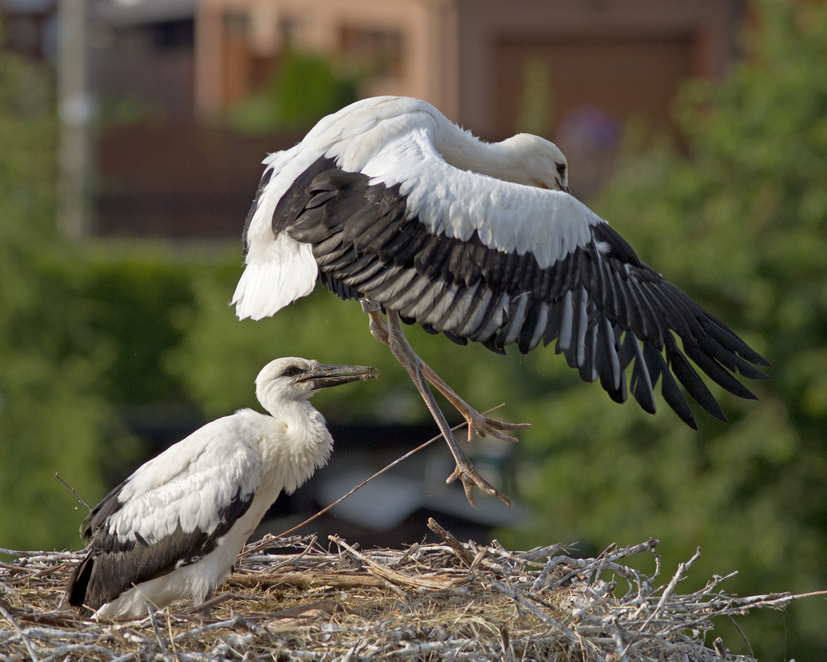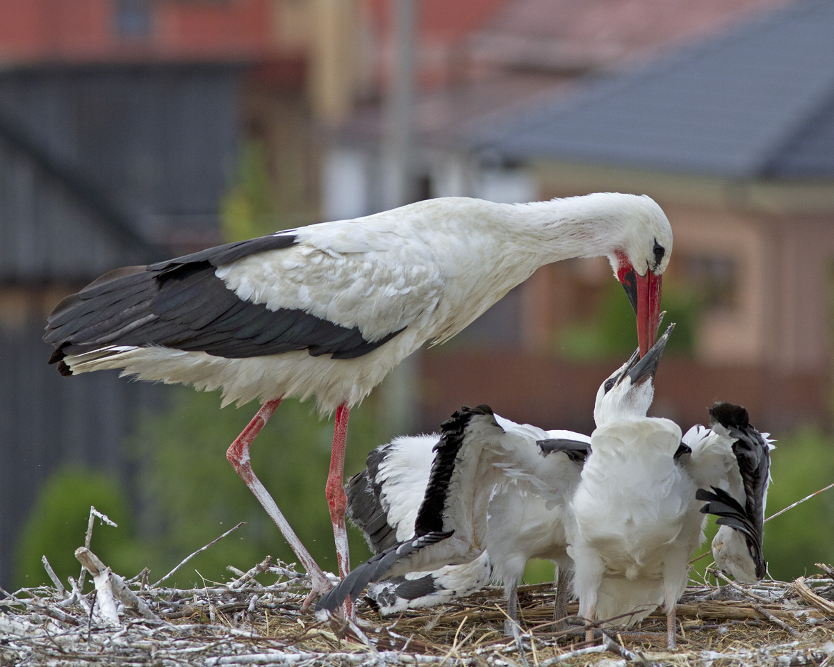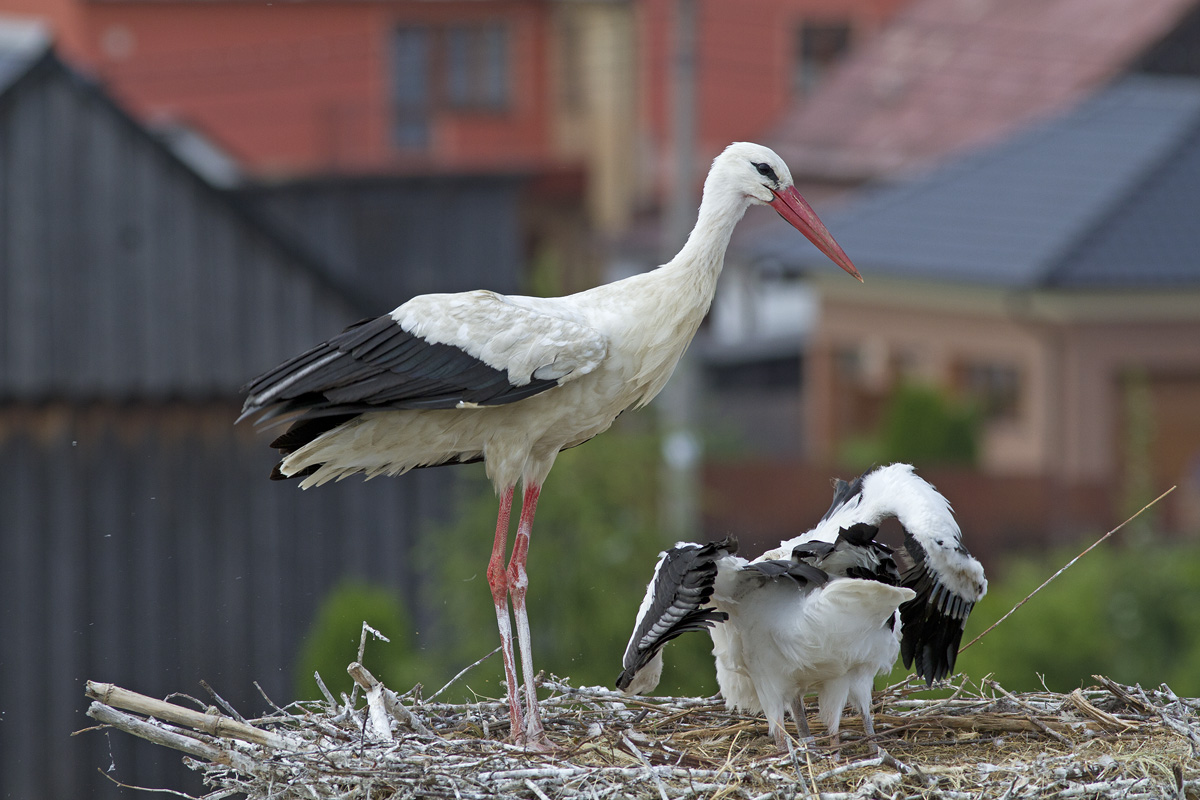 Taková jedna zvláštní rodinka čápů (jedno mládě původní, druhé přidaně z hnízda kde uhynul dospělý čáp).