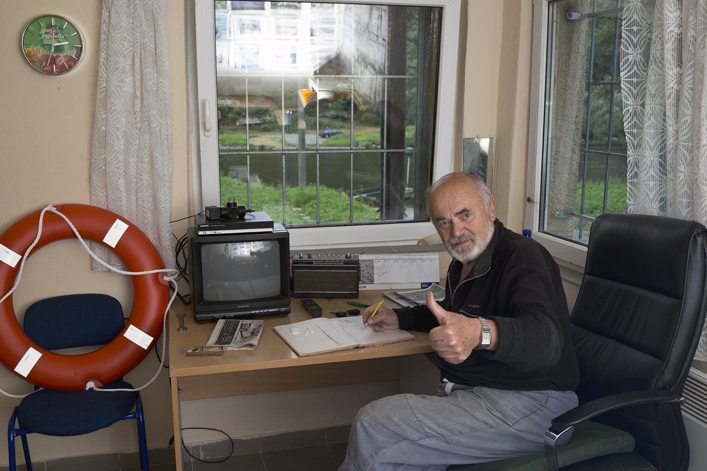 Dnes jsem ve volných chvilkách na přívozu zkoušel své blesky. Ne, že bych trpěl narcisismem, ale skutečně jsem neměl nikoho jiného, kdo by mně postál! A navíc jsem si první fotografování s blesky chtěl vychutnat sám. Potřeboval jsem také expozičně sladit interiér s osvětlením venku ( okno ) a to je v mém případě trochu přemýšlení. Takže by mně kdokoliv jiný zatím stále ještě rušil! Ten odraz v okně jsem holt nedomyslel. :-)