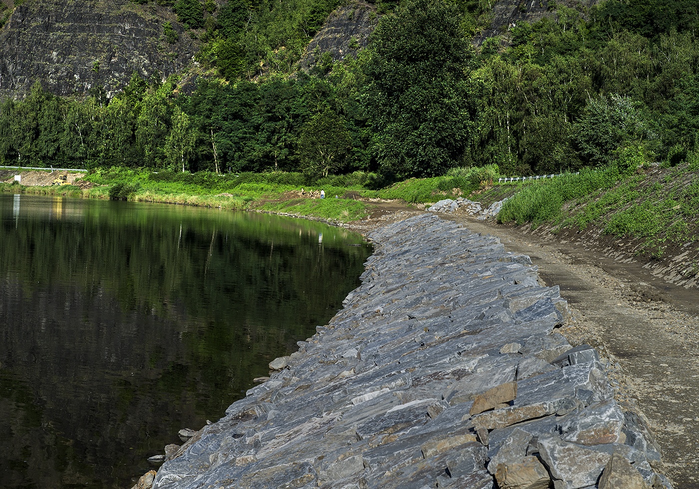 Přikládám fotku budoucí stezky s novou navigaci směrem k řece z těžkých kamenů. Podklad pod stezkou je nově navezený z drobnějšího kamenitého materiáluy a udusán těžkým válcem s hydraulickým dusáním. A jestliže původní navigaci, s mnohem menšími kameny povodně za několik destiletí neporušily, tak tato nová navigace musí vydržet také! Dělají to opravdu důkladně.
