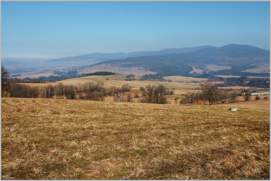 Z nedělního výletu: Vlakem do Podlesí u Malé Moravy, nahoru do Hanušovické hornatiny na Jeřáb (1003 m n.m.), pramen Tiché Orlice, klášter Dolní Hedeč, Králíky. Nádhera. Jenom prd vidět, opar jak prase. Fotky děs, šedivky, něco z toho tahat - hrůza. Na 02 je kostel v Podlesí, na 06 vpravo vpředu Sviní hora, vzadu hřbet Králičáku, pak kaple Svatá Trojice, rozhledna na Valu a konečně klášter z dolního konce aleje v Králíkách.