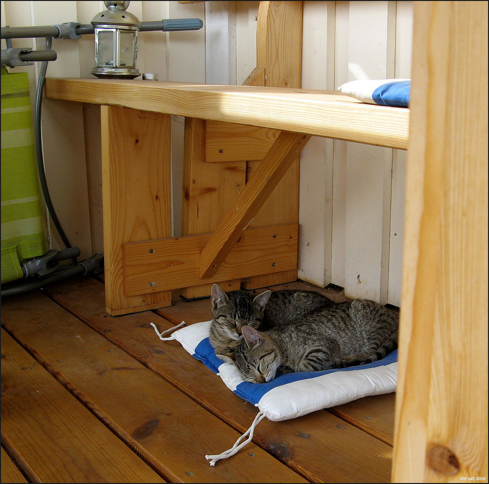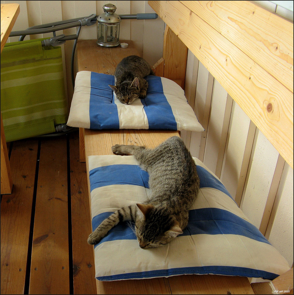 Po lovu se musí odpočívat.A když se zřítějí z lavice i s polštářem,dole je to taky dobrý... :D