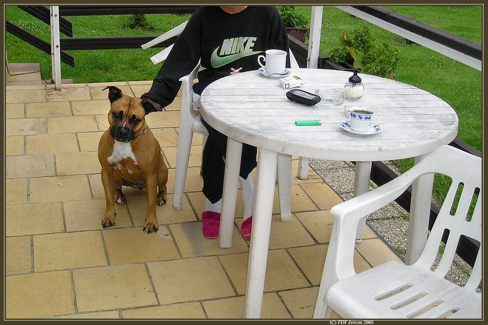 Ranní idilka ve Vernířovicích u kafe před tůrou ...ten čokl nám pořád kradl boty, ale jinak byl hodnej, vona je to vlastně čoklice :D