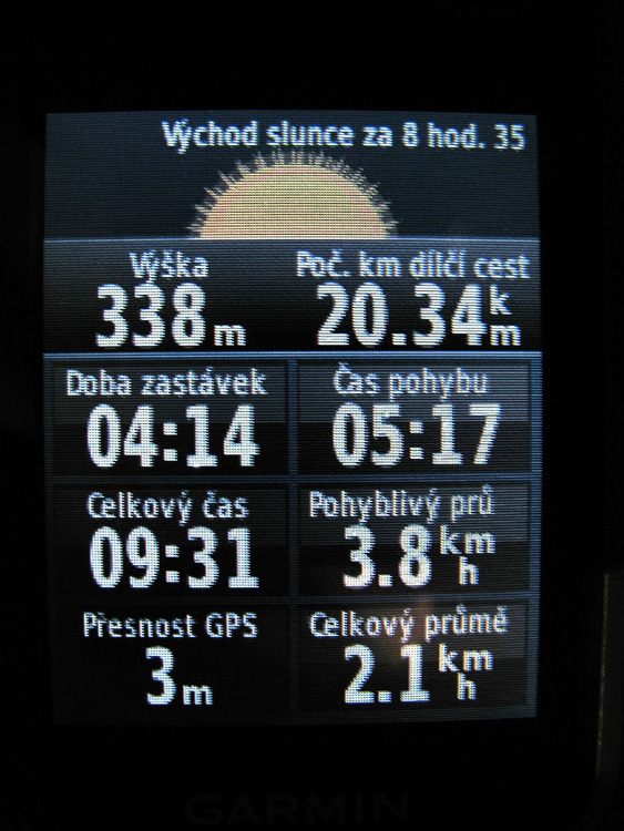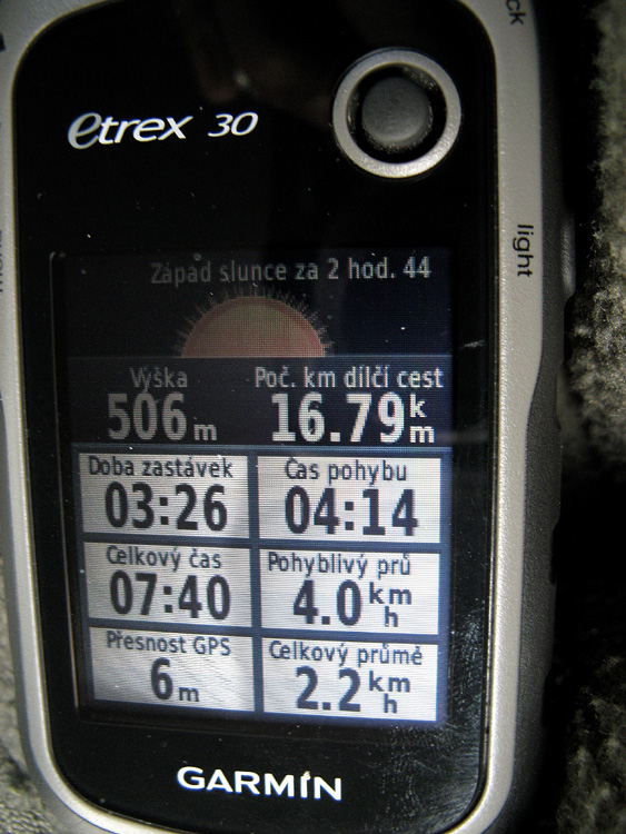 Ale s navigací maximálmí spokojenost, hlavně viditelnost i na plným slunci vynikající a podsvícení úplně vypínám. Ta viditelnost byla důvod, proč jsem koupil navigaci Etrex 30 bez dotykového displeje. Kolega má Garmina Dakotu 10 a na slunci to je zoufalství, prostě člověk nevidí vůbec nic. Zadávání cílů a psaní pomocí toho čudlíku je sice asi pomalejší než u dotykáče, ale na nějaké té minutě mě nezáleží ;) Teď naopak slunce vyhledávám :D