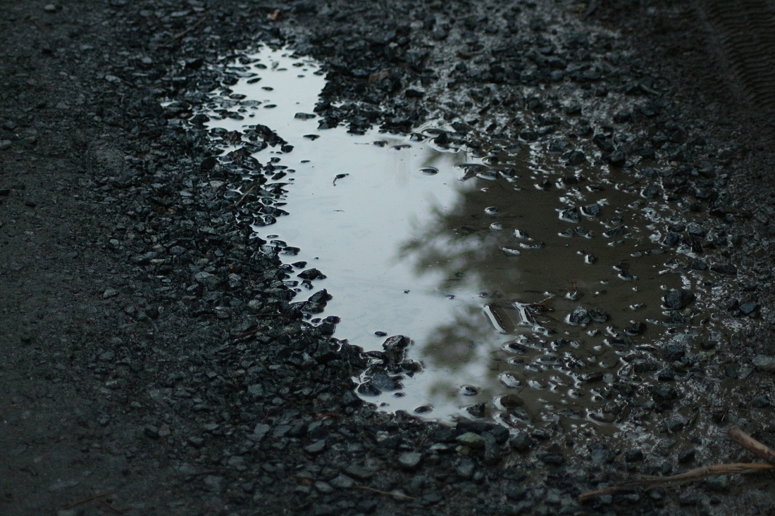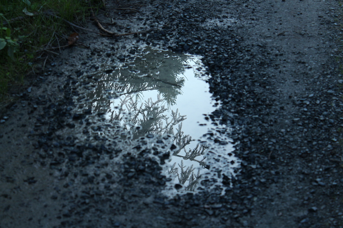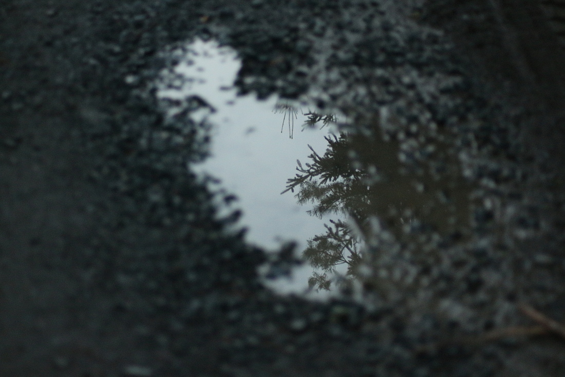 Při focení louže jsem nejprve ručně zaostřila na odraz větvičky na její hladině a exponovala. Pak posunula středový ostřící bod o pár cm do leva (na kamínek) a překvapivě obdržela dost rozdílné snímky. Jako by v prvním případě senzor „viděl“ originál větvičku, vzdálenou asi 4 metry, a ne její odraz na hladině vzdálený málo přes metr.