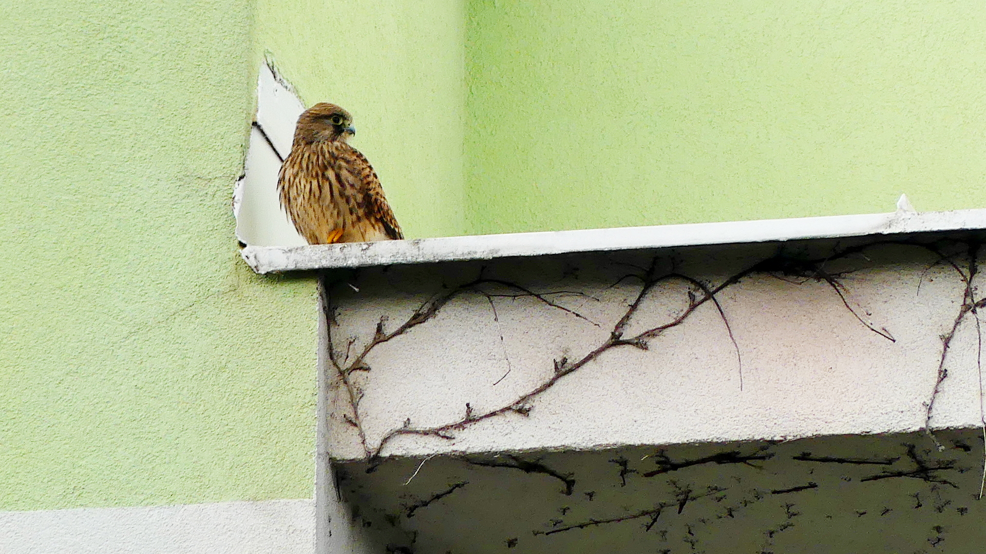 poštolka na protějším paneláku, právě se chystá na svůj první (možná druhý )let