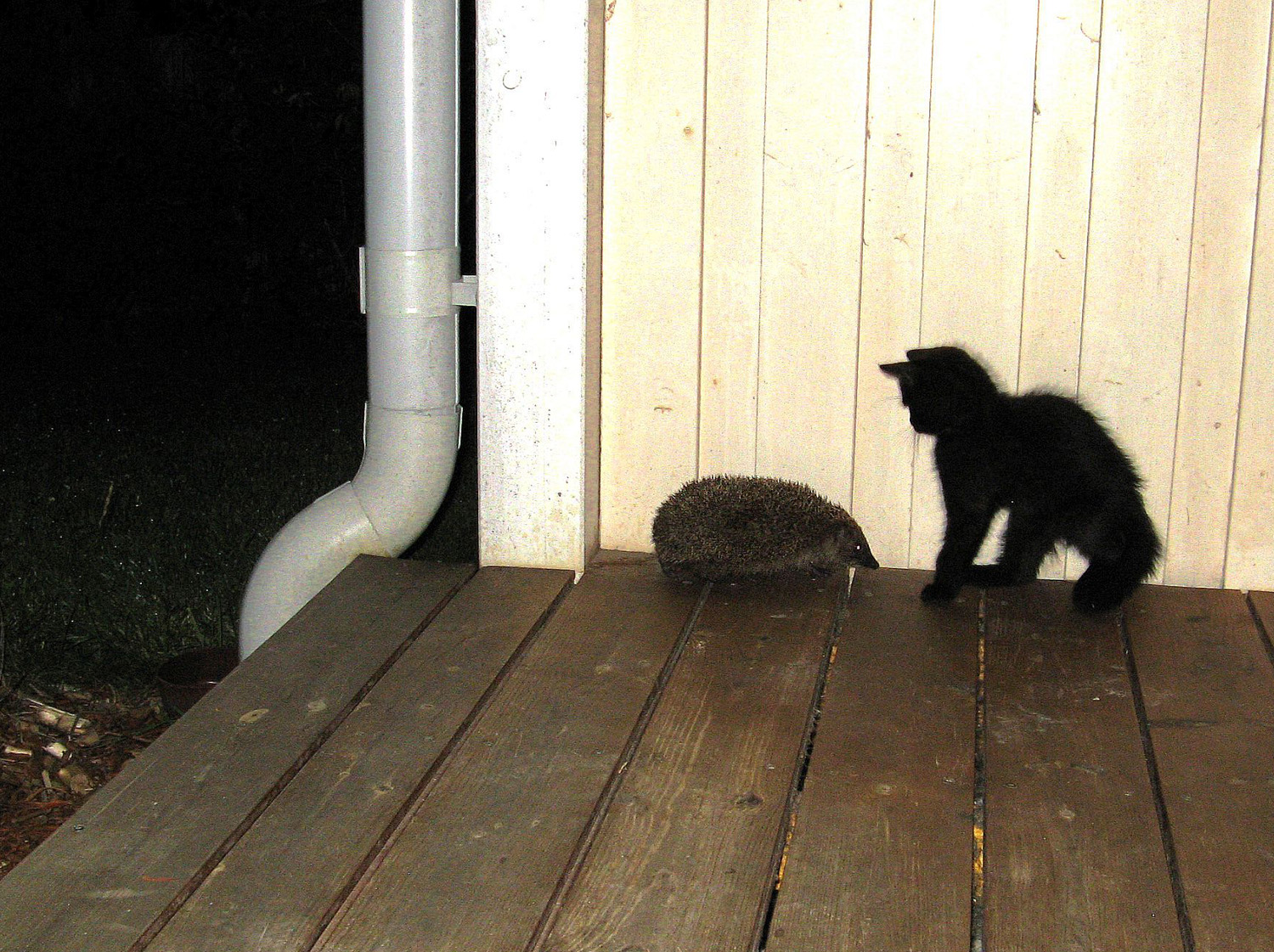 Setkání kotěte s ježkem na terásce ve 23:30 hod. Kvalita je v nedohlednu,ale neodolal jsem to zadokumentovat,jak se celkem kámošili.Mamina velká kočka na to jen z povzdálí povzneseně koukala. :D Další děj,kde měli ježek i kotě čumáky úpně u sebe jsem částečně prošvihnul,částečně to bylo v místě takřka nefotitelném.