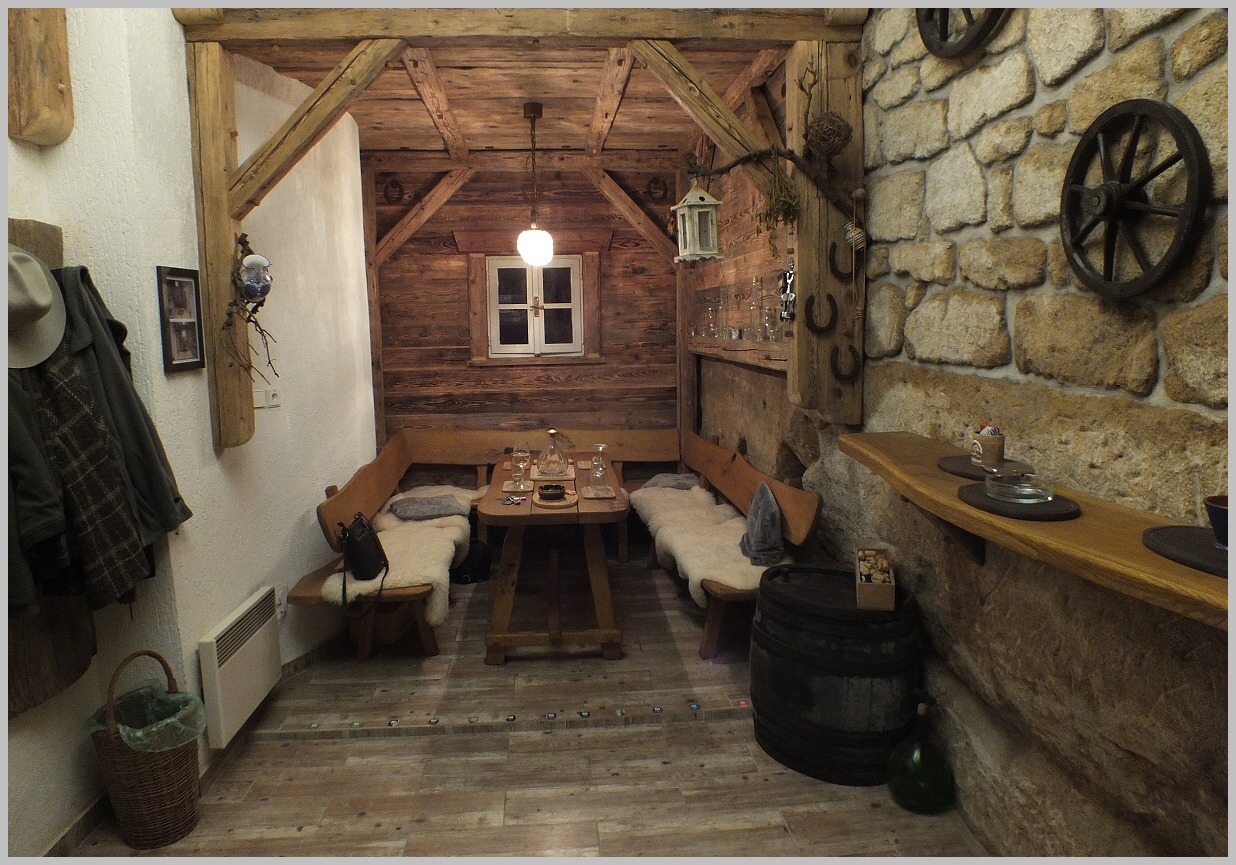 PS: dám pár ,,motivačních fotek" jak si švagr předělal sklep na ,,chlapskou trucovnu" (n) :D .Protože je z Moravy, tak si odtamtud vždy přiveze v autě plný kufr lahví vína a pár demižónků slivovice, meruňkovice, třešňovice a jednou měl i skvostnou ořechovici (n) (n) . A protože není lakomý, vždycky posedíme, uděláme ,,ochutnávku" (n) a pokud si ještě druhý den dokážu vzpomenout co mi chutnalo nejvíce, tak si toho lahvičku odvezu ,,pro potěchu těla i duše". .... i tentokrát jsem si odvezl, a protože si potřebuji udělat alespoň jedno potěšení ráno a večer, tak nějak rychle ubývá (y) .....asi budu muset z půldecáků přejít na menší frťany :D