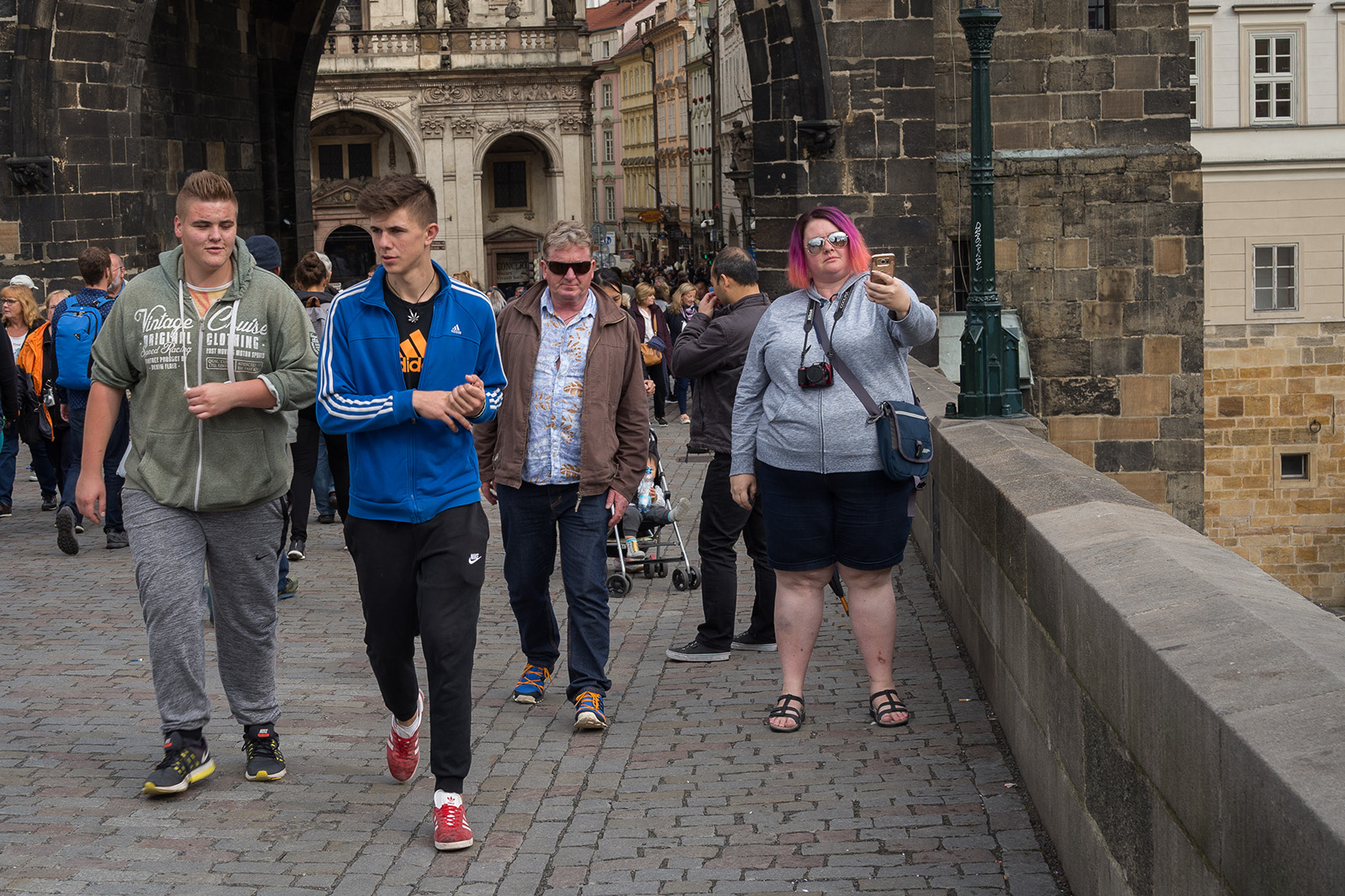 Na můj vkus trochu divnej to zvyk,posedávat na zábradlí - zdi, Karlova mostu a v jeho věku i dost divná a nebezpečná libůstka.Já na most raděj koukám odspodu od Vltavy.
