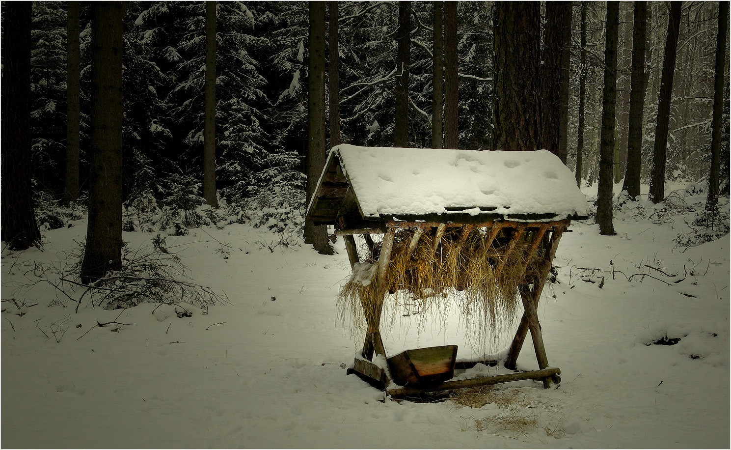Jesličky pro Ježíška,panáčka už jsou připravený dřív, než dorazí ty davy s různýma dárkama...Štědrodenní přilepšení před 13 roky v 15:35 a v 15:38 hod. lesním zvířátkům